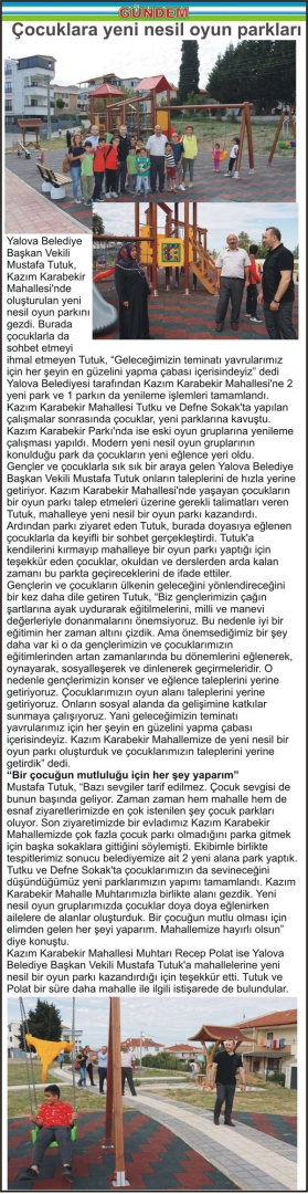 Yalova Belediye Başkan Vekili Mustafa Tutuk, Kazım Karabekir Mahallesi’nde oluşturulan yeni nesil oyun parkını gezdi. Burada çocuklarla da sohbet etmeyi ihmal etmeyen Tutuk, “Geleceğimizin teminatı yavrularımız için her şeyin en güzelini yapma çabası içerisindeyiz” dedi