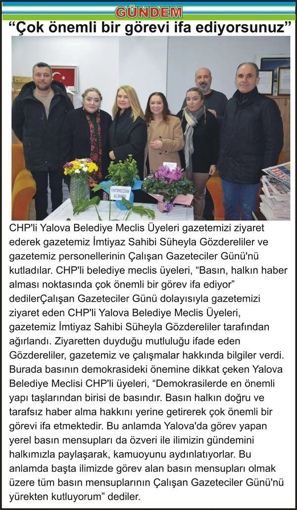 CHP’li Yalova Belediye Meclis Üyeleri gazetemizi ziyaret ederek gazetemiz İmtiyaz Sahibi Süheyla Gözdereliler ve gazetemiz personellerinin Çalışan Gazeteciler Günü’nü kutladılar. CHP’li belediye meclis üyeleri, “Basın, halkın haber alması noktasında çok önemli bir görev ifa ediyor” dedilerÇalışan Gazeteciler Günü dolayısıyla gazetemizi ziyaret eden CHP’li Yalova Belediye Meclis Üyeleri, gazetemiz İmtiyaz Sahibi Süheyla Gözdereliler tarafından ağırlandı. Ziyaretten duyduğu mutluluğu ifade eden Gözdereliler, gazetemiz ve çalışmalar hakkında bilgiler verdi. Burada basının demokrasideki önemine dikkat çeken Yalova Belediye Meclisi CHP’li üyeleri, “Demokrasilerde en önemli yapı taşlarından birisi de basındır. Basın halkın doğru ve tarafsız haber alma hakkını yerine getirerek çok önemli bir görevi ifa etmektedir. Bu anlamda Yalova’da görev yapan yerel basın mensupları da özveri ile ilimizin gündemini halkımızla paylaşarak, kamuoyunu aydınlatıyorlar. Bu anlamda başta ilimizde görev alan basın mensupları olmak üzere tüm basın mensuplarının Çalışan Gazeteciler Günü’nü yürekten kutluyorum” dediler.