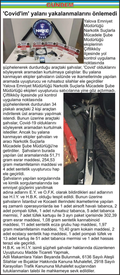 Yalova Emniyet Müdürlüğü Narkotik Suçlarla Mücadele Şube Müdürlüğü ekiplerinin Çiftlikköy ilçesinde yol kontrol uygulama noktasında şüphelenerek durdurduğu araçtaki şahıslar, ‘Covid’ olduklarını söyleyerek aramadan kurtulmaya çalıştılar. Bu yalana kanmayan ekipler şahısların üstünde ve ikametlerinde yapılan aramada uyuşturucu ve ruhsatsız silahlar ele geçirdiler Yalova Emniyet Müdürlüğü Narkotik Suçlarla Mücadele Şube Müdürlüğü ekipleri uyuşturucu satıcılarına yine göz açtırmadı. Çiftlikköy ilçesinde yol kontrol uygulama noktasında şüphelenilerek durdurulan 34 plakalı araçtaki 2 kişi araçtan indirilerek üst araması yapılmak istendi. Bunun üzerine araçtaki şahıslar, Covid-19 olduklarını söyleyerek aramadan kurtulmak istediler. Ancak bu yalana kanmayan ekipler şahısları ve aracı Narkotik Suçlarla Mücadele Şube Müdürlüğü’ne getirdiler. Şahısların burada yapılan üst aramalarında 51,71 gram esrar maddesi, 254,53 gram metamfetamin maddesi ve 4 adet sentetik uyuşturucu hap ele geçirildi. Şahısların yapılan sorgularında ve kimlik sorgulamalarında ise emniyet güçlerini yanıltmak adına adlarını E.Y. ve O.F.K. olarak bildirdikleri asıl adlarının ise H.İ.Y. ve H.B.K. olduğu tespit edildi. Bunun üzerine şahısların İstanbul ve Kocaeli illerindeki ikametlerine yapılan eş zamanlı operasyonlarda ise 1 adet airsoft havalı tabanca, 2 adet pompalı tüfek, 1 adet ruhsatsız tabanca, 5 adet tabanca mermisi, 7 adet tüfek kartuşu ile 3 ayrı paket içerisinde 302,39 gram esrar maddesi, 1,08 gram sentetik kannabinoid maddesi, 11 adet sentetik ecza grubu hap maddesi, 1,97 gram metamfetamin maddesi, 10,40 gram kokain maddesi, 2 adet ecstacy sentetik hap maddesi, 1 adet pompalı tüfek ve 13 adet kartuş ile 51 adet tabanca mermisi ve 1 adet hassas terazi ele geçirildi. H.B.K. ve H.İ.Y. isimli şüpheli şahıslar haklarında düzenlenen Uyuşturucu Madde Ticareti Yapmak, Adli Makamlara Yalan Beyanda Bulunmak, 6136 Sayılı Ateşli Silahlar ve Bıçaklar Hakkında Kanuna Muhalefet, 2918 Sayılı Karayolları Trafik Kanununa Muhalefet suçlarından tutuklanmaları talebi ile mahkemeye sevk edildiler.