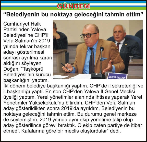 Cumhuriyet Halk Partisi’nden Yalova Belediyesi’ne CHP’li Vefa Salman’ın 2019 yılında tekrar başkan adayı gösterilmesi sonrası ayrılma kararı aldığını söyleyen Doğan, “Taşköprü Belediyesi’nin kurucu başkanlığını yaptım. İki dönem belediye başkanlığı yaptım. CHP’de il sekreterliği ve il başkanlığı yaptı. En son CHP’den Yalova İl Genel Meclisi üyeliği yaptım. Yerel yönetimler alanında ihtisas yaparak Yerel Yönetimler Yüksekokulu’nu bitirdim. CHP’den Vefa Salman aday gösterildikten sonra 2019’da ayrıldım. Belediyenin bu noktaya geleceğini tahmin ettim. Bu durumu genel merkeze de söylemiştim. 2019 yılında aynı ekip yönetime talip olup aday gösterilince görevi bıraktık. O ekip zaten partiye de itibar etmedi. Kafalarına göre bir meclis oluşturdular” dedi.