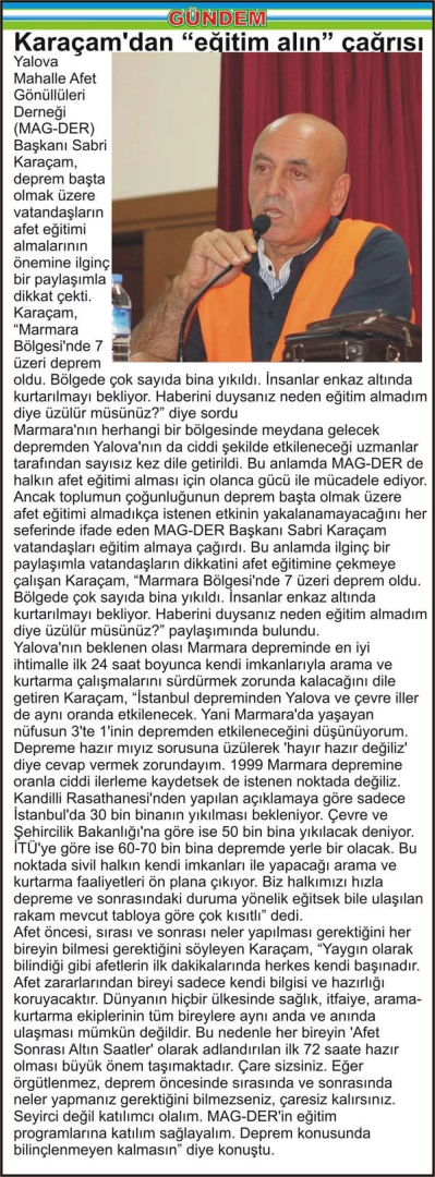 Yalova Mahalle Afet Gönüllüleri Derneği (MAG-DER) Başkanı Sabri Karaçam, deprem başta olmak üzere vatandaşların afet eğitimi almalarının önemine ilginç bir paylaşımla dikkat çekti. Karaçam, “Marmara Bölgesi’nde 7 üzeri deprem oldu. Bölgede çok sayıda bina yıkıldı. İnsanlar enkaz altında kurtarılmayı bekliyor. Haberini duysanız neden eğitim almadım diye üzülür müsünüz?” diye sordu