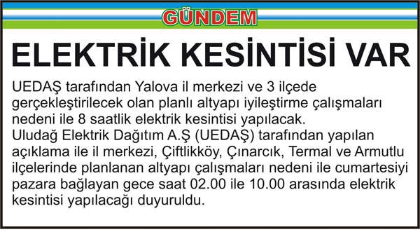 UEDAŞ tarafından Yalova il merkezi ve 3 ilçede gerçekleştirilecek olan planlı altyapı iyileştirme çalışmaları nedeni ile 8 saatlik elektrik kesintisi yapılacak. Uludağ Elektrik Dağıtım A.Ş (UEDAŞ) tarafından yapılan açıklama ile il merkezi, Çiftlikköy, Çınarcık, Termal ve Armutlu ilçelerinde planlanan altyapı çalışmaları nedeni ile cumartesiyi pazara bağlayan gece saat 02.00 ile 10.00 arasında elektrik kesintisi yapılacağı duyuruldu.