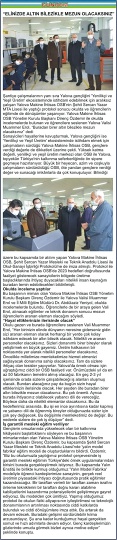 OKUL-SANAYİ İŞ BİRLİĞİNİN EN GÜZEL ÖRNEĞİ “ELİNİZDE ALTIN BİLEZİKLE MEZUN OLACAKSINIZ” İSMAİL ÖZTÜRK Şantiye çalışmalarının yanı sıra Yalova gençliğini ‘Yenilikçi ve Yeşil Üretim’ ekosisteminde istihdam edebilmek için aralıksız çalışan Yalova Makine İhtisas OSB’nin Şehit Sercan Yazar MTA Lisesi ile yaptığı protokol sonucu okulda ve öğrencilerin eğitimde de dönüşümler yaşanıyor. Yalova Makine İhtisas OSB Yönetim Kurulu Başkanı Direnç Özdemir ile okulda incelemelerde bulunan ve öğrencilere seslenen Yalova Valisi Muammer Erol, “Buradan birer altın bilezikle mezun olacaksınız” dedi Sanayicileri hayallerine kavuşturmak, Yalova gençliğini ise ‘Yenilikçi ve Yeşil Üretim’ ekosisteminde istihdam etmek için çalışmaların sürdüğü Yalova Makine İhtisas OSB, gençlere verdiği değerle de dikkatleri üzerine çekti. Yüksek katma değerli, yenilikçi ve yeşil üretim merkezi olan OSB ile Yalova, topyekûn Türkiye’nin kalkınma seferberliğinde ön sipere geçmeye hazırlanıyor. Büyük bir heyecan, azim ve coşkuyla çalışmaların sürdürüldüğü OSB, öte yandan gençlere verdiği değer ve sunacağı imkânlarla da çok konuşuluyor. Bilindiği üzere bu kapsamda bir atılım yapan Yalova Makine İhtisas OSB, Şehit Sercan Yazar Mesleki ve Teknik Anadolu Lisesi ile Okul-Sanayi İşbirliği Protokolü’ne de imza atmıştı. Protokol ile Yalova Makine İhtisas OSB’de 2023 hedefleri doğrultusunda faaliyet gösterecek sanayicilerin bölgede üretime başladıklarında ihtiyaç duyacakları nitelikli insan kaynağını buradan temin edebilecekleri bildirilmişti. Okulda inceleme yaptılar Bu başarının mimarı olan Yalova Makine İhtisas OSB Yönetim Kurulu Başkanı Direnç Özdemir ile Yalova Valisi Muammer Erol ve İl Milli Eğitim Müdürü Dr. Abdülaziz Yeniyol, okulda incelemelerde bulundu. Öğrencilerle de bir araya gelen Vali Erol, alınacak eğitimler ve teknik donanım sonucu mezun öğrencilerin aranan eleman olacağını söyledi. “Hayal ettiklerinizin ilerisinde olacak” Okulu gezen ve burada öğrencilere seslenen Vali Muammer Erol, “Her birinizin elinde dünyanın neresine giderseniz gidin sizi aranan eleman olarak herhangi bir yerde çok kolay istihdam edecek bir altın bilezik olacak. Nitelikli ve aranan personeller olacaksınız. Sizleri donanımlı birer bireyler olarak yetiştirmek en büyük gayemiz. Üretim halkasının bir noktasında yer alarak nitelikli personeller olacaksınız. Öncelikle milletimize memleketimize hizmet etmenizi sağlayacak donanıma sahip olacaksınız. Tam da sizlere ihtiyaç olan tesisler yapıyorlar. Yalova’da örnek olması için uğraştığımız ciddi bir OSB faaliyeti var. Önümüzdeki yıl da en az 50 fabrikanın temelini atmış olacağız. En geç 2-3 yıl içerisinde orada sizlerin çalışabileceği iş alanları oluşmuş olacak. Bundan alacağınız pay da bugün sizin hayal ettiklerinizin ilerisinde olacak. Her şeyden öte buradan birer altın bilezikle mezun olacaksınız. Bu çok önemli. Ayrıca burada ihtiyacınız olabilecek yabancı dili de vereceğiz. Böylece daha da nitelikli elemanlar olacaksınız. Bu da hedeflerimiz arasında. Bu işi en ince ayrıntısına kadar kapmış ve yabancı dili de öğrenmiş bireyler olduğunuzda sizler için çok şey değişecek. Bu değişimle memleketimiz de değişir. Bu nedenle sizlere de çok iş düşüyor” dedi. İş garantili mesleki eğitim veriliyor Gençlerin omuzlarında yükselecek olan bir kalkınma hikâyesini başlattıklarını söyleyen ve bu başarının mimarlarından olan Yalova Makine İhtisas OSB Yönetim Kurulu Başkanı Direnç Özdemir, bu kapsamda Şehit Sercan Yazar Mesleki ve Teknik Anadolu Lisesi’nde ‘yalın model fabrika’ eğitim modeli de oluşturduklarını bildirdi. Özdemir, “Biz bu okulumuzla yaptığımız protokol çerçevesinde iş garantili mesleki eğitimin Türkiye’deki örnek uygulamalarından birisini burada gerçekleştirmek istiyoruz. Bu kapsamda Yalın Enstitü ile birlikte kurmuş olduğumuz ‘Yalın Model Fabrika’ modeliyle öğrenci kardeşlerimize sanayinin, gerçek reel üretimin piyasadaki ihtiyacı doğrultusunda pratik eğitimler kazandıracağız. Bir taraftan verimli bir taraftan zaman israfını önleme tekniklerini bir taraftan doğru kararı alabilme kabiliyetlerini kazandırma potansiyellerini geliştirmeye gayret ediyoruz. Bu modelden çok ümitliyiz. Yapmış olduğumuz protokol ile okulun fiziki altyapısının iyileştirilmesi ve teknolojik donanımlarının artırılması noktasında ciddi katkılarda bulunduk ve ciddi dönüşümlere imza attık. Bu artarak da devam edecek. Buradaki gelişimi sürdürülebilir kılma arzusundayız. Şu ana kadar kurduğumuz hayal gerçekten somut ve hızlı adımlarla devam ediyor. Genç kardeşlerimizin gözlerinde umudu görmek bizleri ayrıca motive ediyor” şeklinde konuştu.
