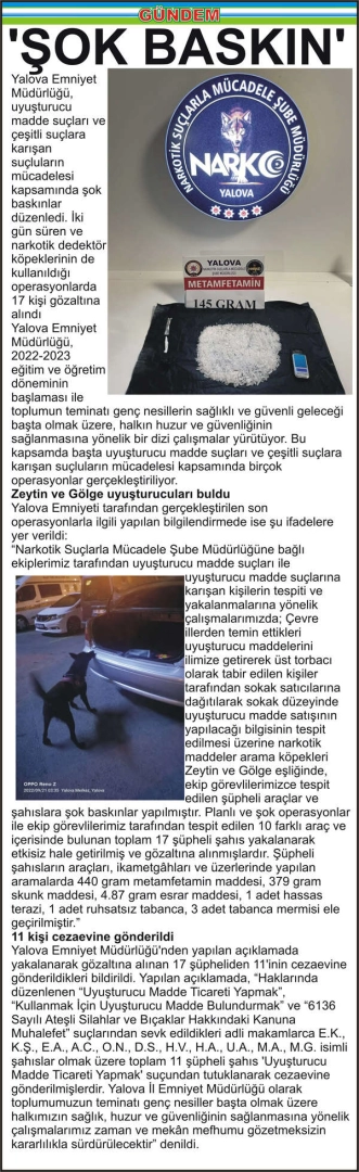 Yalova Emniyet Müdürlüğü, uyuşturucu madde suçları ve çeşitli suçlara karışan suçluların mücadelesi kapsamında şok baskınlar düzenledi. İki gün süren ve narkotik dedektör köpeklerinin de kullanıldığı operasyonlarda 17 kişi gözaltına alındı