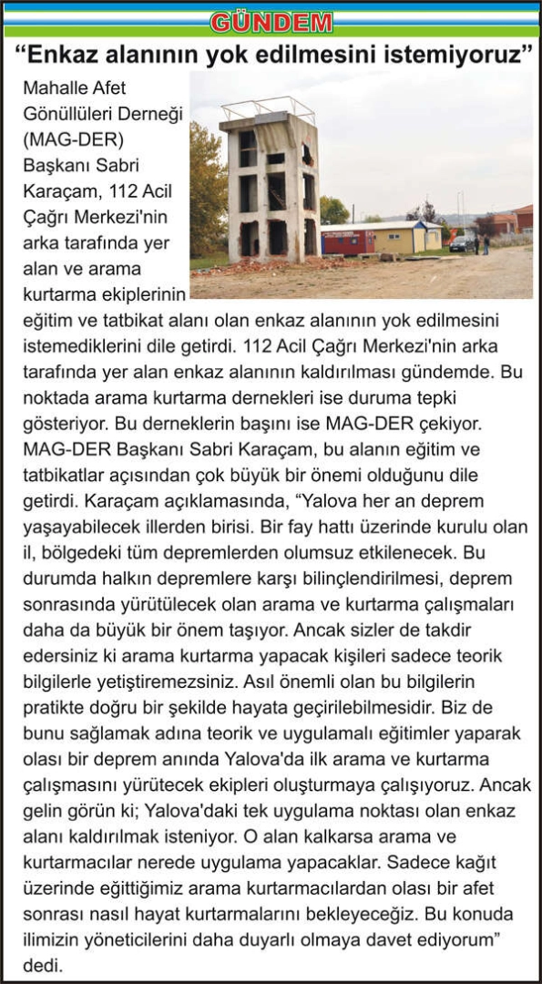Mahalle Afet Gönüllüleri Derneği (MAG-DER) Başkanı Sabri Karaçam, 112 Acil Çağrı Merkezi’nin arka tarafında yer alan ve arama kurtarma ekiplerinin eğitim ve tatbikat alanı olan enkaz alanının yok edilmesini istemediklerini dile getirdi. 112 Acil Çağrı Merkezi’nin arka tarafında yer alan enkaz alanının kaldırılması gündemde. Bu noktada arama kurtarma dernekleri ise duruma tepki gösteriyor. Bu derneklerin başını ise MAG-DER çekiyor. MAG-DER Başkanı Sabri Karaçam, bu alanın eğitim ve tatbikatlar açısından çok büyük bir önemi olduğunu dile getirdi. Karaçam açıklamasında, “Yalova her an deprem yaşayabilecek illerden birisi. Bir fay hattı üzerinde kurulu olan il, bölgedeki tüm depremlerden olumsuz etkilenecek. Bu durumda halkın depremlere karşı bilinçlendirilmesi, deprem sonrasında yürütülecek olan arama ve kurtarma çalışmaları daha da büyük bir önem taşıyor. Ancak sizler de takdir edersiniz ki arama kurtarma yapacak kişileri sadece teorik bilgilerle yetiştiremezsiniz. Asıl önemli olan bu bilgilerin pratikte doğru bir şekilde hayata geçirilebilmesidir. Biz de bunu sağlamak adına teorik ve uygulamalı eğitimler yaparak olası bir deprem anında Yalova’da ilk arama ve kurtarma çalışmasını yürütecek ekipleri oluşturmaya çalışıyoruz. Ancak gelin görün ki; Yalova’daki tek uygulama noktası olan enkaz alanı kaldırılmak isteniyor. O alan kalkarsa arama ve kurtarmacılar nerede uygulama yapacaklar. Sadece kağıt üzerinde eğittiğimiz arama kurtarmacılardan olası bir afet sonrası nasıl hayat kurtarmalarını bekleyeceğiz. Bu konuda ilimizin yöneticilerini daha duyarlı olmaya davet ediyorum” dedi.