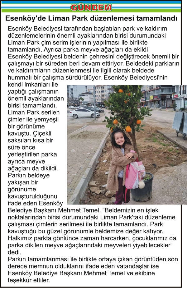 Esenköy Belediyesi tarafından başlatılan park ve kaldırım düzenlemelerinin önemli ayaklarından birisi durumundaki Liman Park çim serim işlerinin yapılması ile birlikte tamamlandı. Ayrıca parka meyve ağaçları da ekildi
