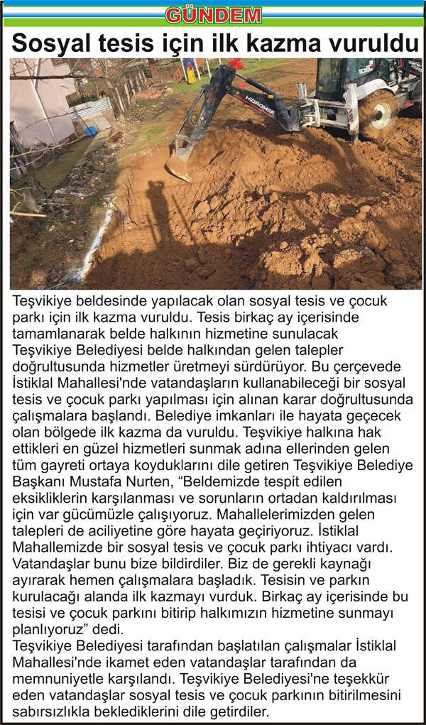Teşvikiye beldesinde yapılacak olan sosyal tesis ve çocuk parkı için ilk kazma vuruldu. Tesis birkaç ay içerisinde tamamlanarak belde halkının hizmetine sunulacak