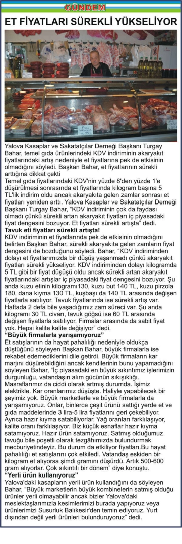 Yalova Kasaplar ve Sakatatçılar Derneği Başkanı Turgay Bahar, temel gıda ürünlerindeki KDV indiriminin akaryakıt fiyatlarındaki artış nedeniyle et fiyatlarına pek de etkisinin olmadığını söyledi. Başkan Bahar, et fiyatlarının sürekli arttığına dikkat çekti