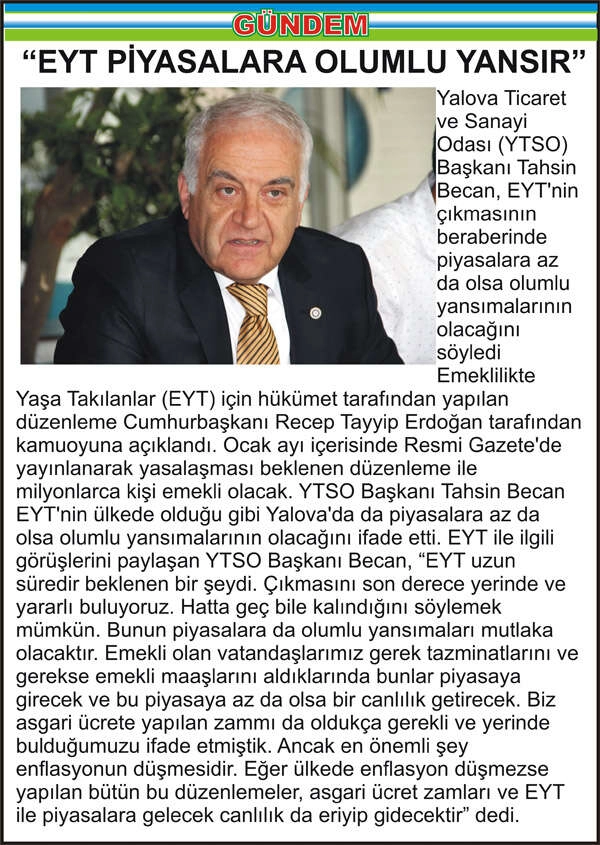 Yalova Ticaret ve Sanayi Odası (YTSO) Başkanı Tahsin Becan, EYT’nin çıkmasının beraberinde piyasalara az da olsa olumlu yansımalarının olacağını söyledi Emeklilikte Yaşa Takılanlar (EYT) için hükümet tarafından yapılan düzenleme Cumhurbaşkanı Recep Tayyip Erdoğan tarafından kamuoyuna açıklandı. Ocak ayı içerisinde Resmi Gazete’de yayınlanarak yasalaşması beklenen düzenleme ile milyonlarca kişi emekli olacak. YTSO Başkanı Tahsin Becan EYT’nin ülkede olduğu gibi Yalova’da da piyasalara az da olsa olumlu yansımalarının olacağını ifade etti. EYT ile ilgili görüşlerini paylaşan YTSO Başkanı Becan, “EYT uzun süredir beklenen bir şeydi. Çıkmasını son derece yerinde ve yararlı buluyoruz. Hatta geç bile kalındığını söylemek mümkün. Bunun piyasalara da olumlu yansımaları mutlaka olacaktır. Emekli olan vatandaşlarımız gerek tazminatlarını ve gerekse emekli maaşlarını aldıklarında bunlar piyasaya girecek ve bu piyasaya az da olsa bir canlılık getirecek. Biz asgari ücrete yapılan zammı da oldukça gerekli ve yerinde bulduğumuzu ifade etmiştik. Ancak en önemli şey enflasyonun düşmesidir. Eğer ülkede enflasyon düşmezse yapılan bütün bu düzenlemeler, asgari ücret zamları ve EYT ile piyasalara gelecek canlılık da eriyip gidecektir” dedi.