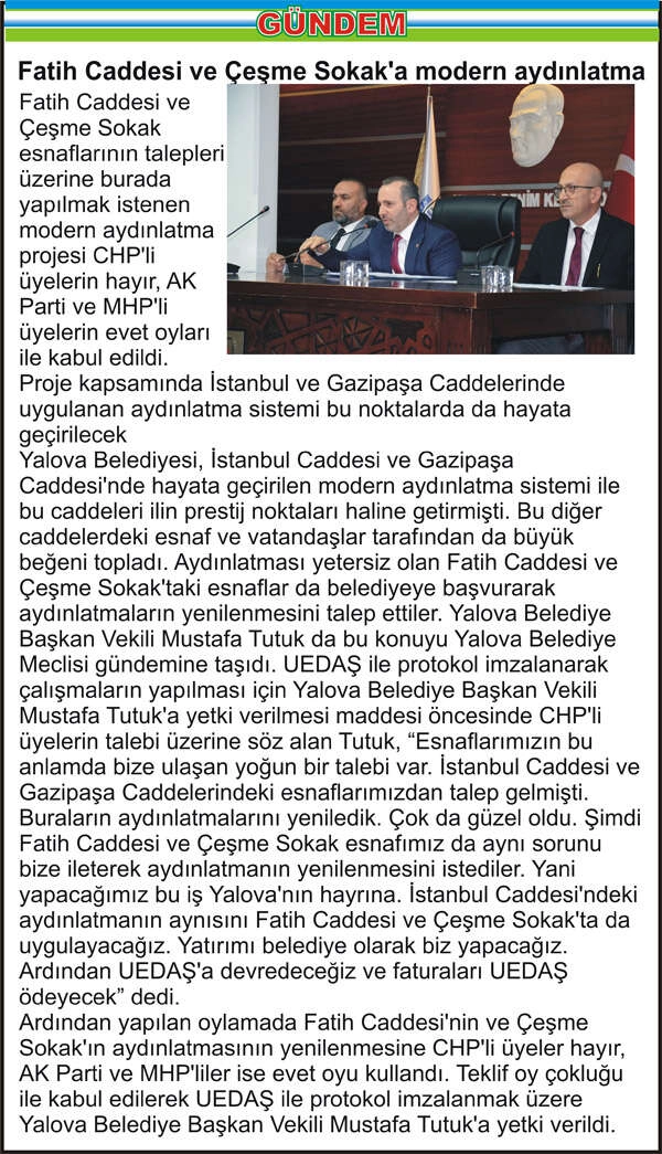 Fatih Caddesi ve Çeşme Sokak esnaflarının talepleri üzerine burada yapılmak istenen modern aydınlatma projesi CHP’li üyelerin hayır, AK Parti ve MHP’li üyelerin evet oyları ile kabul edildi. Proje kapsamında İstanbul ve Gazipaşa Caddelerinde uygulanan aydınlatma sistemi bu noktalarda da hayata geçirilecek Yalova Belediyesi, İstanbul Caddesi ve Gazipaşa Caddesi’nde hayata geçirilen modern aydınlatma sistemi ile bu caddeleri ilin prestij noktaları haline getirmişti. Bu diğer caddelerdeki esnaf ve vatandaşlar tarafından da büyük beğeni topladı. Aydınlatması yetersiz olan Fatih Caddesi ve Çeşme Sokak’taki esnaflar da belediyeye başvurarak aydınlatmaların yenilenmesini talep ettiler. Yalova Belediye Başkan Vekili Mustafa Tutuk da bu konuyu Yalova Belediye Meclisi gündemine taşıdı. UEDAŞ ile protokol imzalanarak çalışmaların yapılması için Yalova Belediye Başkan Vekili Mustafa Tutuk’a yetki verilmesi maddesi öncesinde CHP’li üyelerin talebi üzerine söz alan Tutuk, “Esnaflarımızın bu anlamda bize ulaşan yoğun bir talebi var. İstanbul Caddesi ve Gazipaşa Caddelerindeki esnaflarımızdan talep gelmişti. Buraların aydınlatmalarını yeniledik. Çok da güzel oldu. Şimdi Fatih Caddesi ve Çeşme Sokak esnafımız da aynı sorunu bize ileterek aydınlatmanın yenilenmesini istediler. Yani yapacağımız bu iş Yalova’nın hayrına. İstanbul Caddesi’ndeki aydınlatmanın aynısını Fatih Caddesi ve Çeşme Sokak’ta da uygulayacağız. Yatırımı belediye olarak biz yapacağız. Ardından UEDAŞ’a devredeceğiz ve faturaları UEDAŞ ödeyecek” dedi. Ardından yapılan oylamada Fatih Caddesi’nin ve Çeşme Sokak’ın aydınlatmasının yenilenmesine CHP’li üyeler hayır, AK Parti ve MHP’liler ise evet oyu kullandı. Teklif oy çokluğu ile kabul edilerek UEDAŞ ile protokol imzalanmak üzere Yalova Belediye Başkan Vekili Mustafa Tutuk’a yetki verildi.
