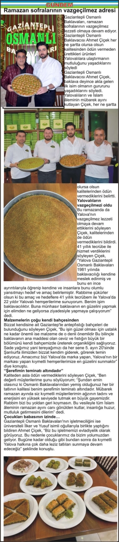Gaziantepli Osmanlı Baklavaları, ramazan sofralarının vazgeçilmez lezzeti olmaya devam ediyor. Gaziantepli Osmanlı Baklavacısı Ahmet Çiçek her ne şartta olursa olsun kalitesinden ödün vermeden ürettikleri ürünleri Yalovalılara ulaştırmanın mutluluğunu yaşadıklarını söyledi