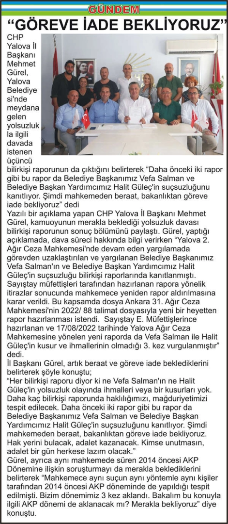 CHP Yalova İl Başkanı Mehmet Gürel, Yalova Belediyesi’nde meydana gelen yolsuzlukla ilgili davada istenen üçüncü bilirkişi raporunun da çıktığını belirterek “Daha önceki iki rapor gibi bu rapor da Belediye Başkanımız Vefa Salman ve Belediye Başkan Yardımcımız Halit Güleç’in suçsuzluğunu kanıtlıyor. Şimdi mahkemeden beraat, bakanlıktan göreve iade bekliyoruz” dedi Yazılı bir açıklama yapan CHP Yalova İl Başkanı Mehmet Gürel, kamuoyunun merakla beklediği yolsuzluk davası bilirkişi raporunun sonuç bölümünü paylaştı. Gürel, yaptığı açıklamada, dava süreci hakkında bilgi verirken “Yalova 2. Ağır Ceza Mahkemesi’nde devam eden yargılamada görevden uzaklaştırılan ve yargılanan Belediye Başkanımız Vefa Salman’ın ve Belediye Başkan Yardımcımız Halit Güleç’in suçsuzluğu bilirkişi raporlarında kanıtlanmıştı. Sayıştay müfettişleri tarafından hazırlanan rapora yönelik itirazlar sonucunda mahkemece yeniden rapor aldırılmasına karar verildi. Bu kapsamda dosya Ankara 31. Ağır Ceza Mahkemesi’nin 2022/ 88 talimat dosyasıyla yeni bir heyetten rapor hazırlanması istendi. Sayıştay E. Müfettişlerince hazırlanan ve 17/08/2022 tarihinde Yalova Ağır Ceza Mahkemesine yönelen yeni raporda da Vefa Salman ile Halit Güleç’in kusur ve ihmallerinin olmadığı 3. kez vurgulanmıştır” dedi. İl Başkanı Gürel, artık beraat ve göreve iade beklediklerini belirterek şöyle konuştu; “Her bilirkişi raporu diyor ki ne Vefa Salman’ın ne Halit Güleç’in yolsuzluk olayında ihmalleri veya bir kusurları yok. Daha kaç bilirkişi raporunda haklılığımızı, mağduriyetimizi tespit edilecek. Daha önceki iki rapor gibi bu rapor da Belediye Başkanımız Vefa Salman ve Belediye Başkan Yardımcımız Halit Güleç’in suçsuzluğunu kanıtlıyor. Şimdi mahkemeden beraat, bakanlıktan göreve iade bekliyoruz. Hak yerini bulacak, adalet kazanacak. Kimse unutmasın, adalet bir gün herkese lazım olacak.” Gürel, ayrıca aynı mahkemede süren 2014 öncesi AKP Dönemine ilişkin soruşturmayı da merakla beklediklerini belirterek “Mahkemece aynı suçun aynı yöntemle aynı kişiler tarafından 2014 öncesi AKP döneminde de yapıldığı tespit edilmişti. Bizim dönemimiz 3 kez aklandı. Bakalım bu konuyla ilgili AKP dönemi de aklanacak mı? Merakla bekliyoruz” diye konuştu.