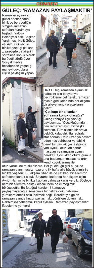 Ramazan ayının en güzel adetlerinden birlik ve beraberliğin simgesi ramazan sofraları kurulmaya başladı. Yalova Belediyesi eski Başkan Yardımcısı Halit Güleç, eşi Aynur Güleç ile birlikte yaptığı çat kapı ziyaretlerle bir ailenin sofrasına konuk olarak bu âdeti sürdürüyor Sosyal medya hesabından yaşadığı manevi duygulara ilişkin paylaşım yapan Halit Güleç, ramazan ayının ilk haftasını aile bireyleriyle geçirdiklerini belirterek, ramazan ayının geri kalanında her akşam bir aileye konuk olacaklarını belirtti. “Çat kapı bir ailemizin sofrasına konuk olacağız” Güleç konuyla ilgili yaptığı paylaşımda, “Çocukluğumdan beri ramazan ayını bir başka severim. Tüm ailenin bir araya geldiği, kalabalık iftar sofraları, iftar sonrası uzun uzadıya devam eden hoş sohbetler ve tabi ki demli bir bardak çay eşliğinde yarı uykulu oturulan sahur masaları ve ramazan ayının bereketi. Çocukken oturduğumuz ana-babamızın masasına artık kendi çocuklarımız ile oturuyoruz, ne mutlu bizlere. Her yıl olduğu gibi bu yıl da ramazan ayının eşsiz huzurunu ilk hafta aile büyüklerimiz ile birlikte yaşadık. Bu akşam itibari ile de çat kapı bir ailemizin sofrasına konuk olduk. Bayrama kadar da her akşam eşim Aynur Hanım ile birlikte kapıları çalmaya karar verdik. Böylece hem bir ailemize destek olacak hem de ekmeğimizi bölüşeceğiz. Bu fotoğraf karelerini kamuoyu paylaşmayacağız. Amacımız bir nebze dokunabilmek yüreklere ancak asla incitmek değil. Bereketiyle gelen ramazan ayında huzur paylaşmak, gönüllere dokunmak. Rabbim ibadetlerimizi kabul eylesin. Ramazan paylaşmaktır” ifadelerine yer verdi.