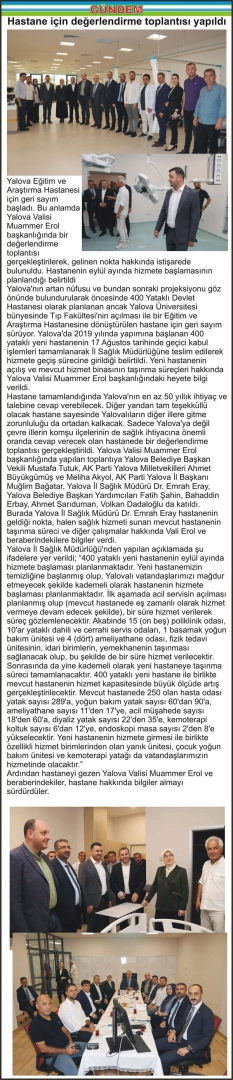 Yalova Eğitim ve Araştırma Hastanesi için geri sayım başladı. Bu anlamda Yalova Valisi Muammer Erol başkanlığında bir değerlendirme toplantısı gerçekleştirilerek, gelinen nokta hakkında istişarede bulunuldu. Hastanenin eylül ayında hizmete başlamasının planlandığı belirtildi