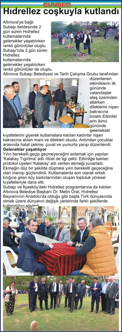 Altınova’ya bağlı Subaşı beldesinde 2 gün süren Hıdrellez kutlamalarında gelenekler yaşatılırken renkli görüntüler oluştu Subaşı’nda 2 gün süren Hıdrellez kutlamalarında gelenekler yaşatılırken renkli görüntüler de oluştu. Altınova Subaşı Belediyesi ve Tarih Çalışma Grubu tarafından düzenlenen etkinliklerin ilk gününde vatandaşlar ateş üzerinden atlarken dileklerini nişan bakracına bıraktı.Etkinliklerin ikinci gününde geleneksel kıyafetlerini giyerek kutlamalara katılan kadınlar nişan bakracına atılan mani ve dilekleri okudu. Ardından çocuklar arasında halat çekme, çuval ve yumurta yarışı düzenlendi. Gelenekler yaşatılıyor Yılın bereketli geçip geçmeyeceğini anlamak için yapılan ‘Kalakay Tıgırtma’ adlı ritüel de ilgi çekti. Etkinliğe katılan protokol üyeleri ‘Kalakay’ adı verilen ekmeği yuvarladı. Ekmeğin düz bir şekilde düşmesi yılın bereketli geçeceğine olan inanışı güçlendirdi. Kutlamalarda son olarak erkek kılığına giren köy kadınlarından oluşan topluluk yöresel kıyafetleriyle dans etti. Subaşı ve İlyasköy’deki Hıdrellez programlarına da katılan Altınova Belediye Başkanı Dr. Metin Oral, Hıdrellez Bayramının Anadolu’da olduğu gibi başta Türk dünyasında olmak üzere dünyanın değişik yerlerinde farklı şekillerde kutlandığını söyledi.