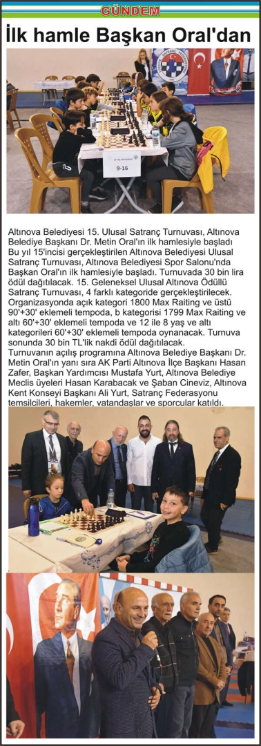 Altınova Belediyesi 15. Ulusal Satranç Turnuvası, Altınova Belediye Başkanı Dr. Metin Oral’ın ilk hamlesiyle başladı Bu yıl 15’incisi gerçekleştirilen Altınova Belediyesi Ulusal Satranç Turnuvası, Altınova Belediyesi Spor Salonu’nda Başkan Oral’ın ilk hamlesiyle başladı. Turnuvada 30 bin lira ödül dağıtılacak. 15. Geleneksel Ulusal Altınova Ödüllü Satranç Turnuvası, 4 farklı kategoride gerçekleştirilecek. Organizasyonda açık kategori 1800 Max Raiting ve üstü 90’+30’ eklemeli tempoda, b kategorisi 1799 Max Raiting ve altı 60’+30’ eklemeli tempoda ve 12 ile 8 yaş ve altı kategorileri 60’+30’ eklemeli tempoda oynanacak. Turnuva sonunda 30 bin TL’lik nakdi ödül dağıtılacak. Turnuvanın açılış programına Altınova Belediye Başkanı Dr. Metin Oral’ın yanı sıra AK Parti Altınova İlçe Başkanı Hasan Zafer, Başkan Yardımcısı Mustafa Yurt, Altınova Belediye Meclis üyeleri Hasan Karabacak ve Şaban Cineviz, Altınova Kent Konseyi Başkanı Ali Yurt, Satranç Federasyonu temsilcileri, hakemler, vatandaşlar ve sporcular katıldı.