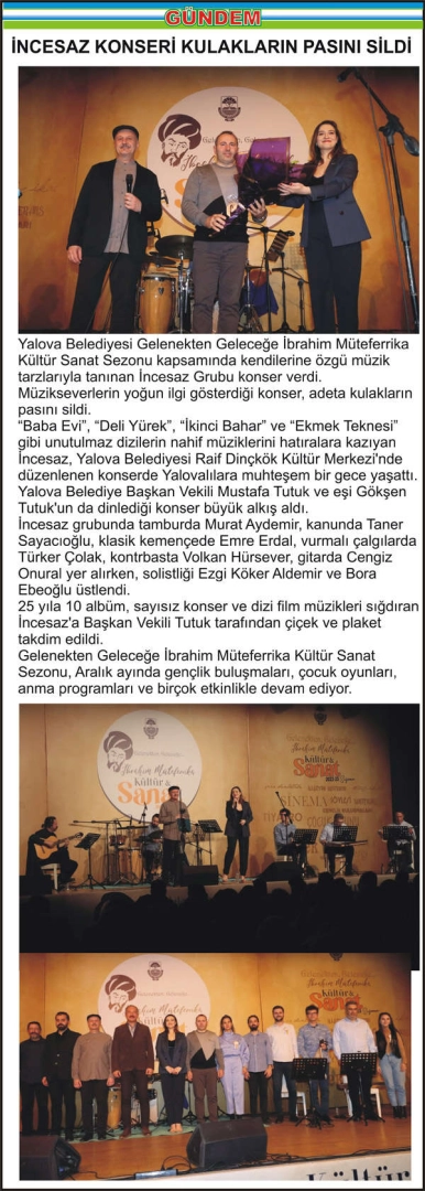 Yalova Belediyesi Gelenekten Geleceğe İbrahim Müteferrika Kültür Sanat Sezonu kapsamında kendilerine özgü müzik tarzlarıyla tanınan İncesaz Grubu konser verdi. Müzikseverlerin yoğun ilgi gösterdiği konser, adeta kulakların pasını sildi.
