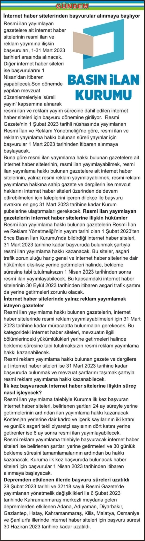 Resmi ilan yayımlayan gazetelere ait internet haber sitelerinin resmi ilan ve reklam yayımına ilişkin başvuruları, 1-31 Mart 2023 tarihleri arasında alınacak. Diğer internet haber siteleri ise başvurularını 1 Nisan’dan itibaren yapabilecek.Son dönemde yapılan mevzuat düzenlemeleriyle ‘süreli yayın’ kapsamına alınarak resmi ilan ve reklam yayım sürecine dahil edilen internet haber siteleri için başvuru dönemine giriliyor. Resmi Gazete’nin 1 Şubat 2023 tarihli nüshasında yayımlanan Resmi İlan ve Reklam Yönetmeliği’ne göre, resmi ilan ve reklam yayınlama hakkı bulunan süreli yayınlar için başvurular 1 Mart 2023 tarihinden itibaren alınmaya başlayacak. Buna göre resmi ilan yayımlama hakkı bulunan gazetelere ait internet haber sitelerinin, resmi ilan yayımlayabilmek, resmi ilan yayınlama hakkı bulunan gazetelere ait internet haber sitelerinin, yalnız resmi reklam yayımlayabilmek, resmi reklam yayımlama hakkına sahip gazete ve dergilerin ise mevcut haklarını internet haber siteleri üzerinden de devam ettirebilmeleri için taleplerini içeren dilekçe ile başvuru evrakını en geç 31 Mart 2023 tarihine kadar Kurum şubelerine ulaştırmaları gerekecek. Resmi ilan yayımlayan gazetelerin internet haber sitelerine ilişkin hükümler Resmi ilan yayımlama hakkı bulunan gazetelerin Resmi İlan ve Reklam Yönetmeliği’nin yayım tarihi olan 1 Şubat 2023’ten önce Basın İlan Kurumu’nda bildirdiği internet haber siteleri, 31 Mart 2023 tarihine kadar başvuruda bulunmak şartıyla resmi ilan yayımlama hakkı kazanacak. Bu siteler, asgari trafik zorunluluğu hariç genel ve internet haber sitelerine dair hükümleri eksiksiz yerine getirmeleri halinde, bekleme süresine tabi tutulmaksızın 1 Nisan 2023 tarihinden sonra resmî ilan yayımlayabilecek. Bu kapsamdaki internet haber sitelerinin 30 Eylül 2023 tarihinden itibaren asgari trafik şartını da yerine getirmeleri zorunlu olacak. İnternet haber sitelerinde yalnız reklam yayımlamak isteyen gazeteler Resmi ilan yayımlama hakkı bulunan gazetelerin, internet haber sitelerinde resmi reklam yayımlayabilmeleri için 31 Mart 2023 tarihine kadar müracaatta bulunmaları gerekecek. Bu kategorideki internet haber siteleri, mevzuatın ilgili bölümlerindeki yükümlülükleri yerine getirmeleri halinde bekleme süresine tabi tutulmaksızın resmi reklam yayımlama hakkı kazanabilecek. Resmi reklam yayımlama hakkı bulunan gazete ve dergilere ait internet haber siteleri ise 31 Mart 2023 tarihine kadar başvuruda bulunmak ve mevzuat şartlarını taşımak şartıyla resmi reklam yayımlama hakkı kazanabilecek. İlk kez başvuracak internet haber sitelerine ilişkin süreç nasıl işleyecek? Resmi ilan yayımlama talebiyle Kuruma ilk kez başvuran internet haber siteleri, belirlenen şartları 24 ay süreyle yerine getirmelerinin ardından ilan yayımlama hakkı kazanacak. Kontenjan yerlerine dair kadro ve içerik sayılarının iki katını ve günlük asgari tekil ziyaretçi sayısının dört katını yerine getirenler ise 6 ay sonra resmi ilan yayımlayabilecek. Resmi reklam yayımlama talebiyle başvuracak internet haber siteleri ise belirlenen şartları yerine getirmeleri ve 30 günlük bekleme süresini tamamlamalarının ardından bu hakkı kazanacak. Kuruma ilk kez başvuruda bulunacak haber siteleri için başvurular 1 Nisan 2023 tarihinden itibaren alınmaya başlayacak. Depremden etkilenen illerde başvuru süreleri uzatıldı 28 Şubat 2023 tarihli ve 32118 sayılı Resmi Gazete’de yayımlanan yönetmelik değişiklikleri ile 6 Şubat 2023 tarihinde Kahramanmaraş merkezli meydana gelen depremlerden etkilenen Adana, Adıyaman, Diyarbakır, Gaziantep, Hatay, Kahramanmaraş, Kilis, Malatya, Osmaniye ve Şanlıurfa illerinde internet haber siteleri için başvuru süresi 30 Haziran 2023 tarihine kadar uzatıldı.