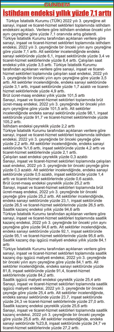 İstihdam endeksi yıllık yüzde 7,1 arttı Türkiye İstatistik Kurumu (TÜİK) 2022 yılı 3. çeyreğine ait sanayi, inşaat ve ticaret-hizmet sektörleri toplamında istihdam endeksini açıkladı. Verilere göre istihdam endekse önceki yılın aynı çeyreğine göre yüzde 7,1 oranında artış gösterdi. Türkiye İstatistik Kurumu tarafından açıklanan verilere göre sanayi, inşaat ve ticaret-hizmet sektörleri toplamında istihdam endeksi, 2022 yılı 3. çeyreğinde bir önceki yılın aynı çeyreğine göre yüzde 7,1 arttı. Alt sektörler incelendiğinde endeks sanayi sektöründe yüzde 6,1, inşaat sektöründe yüzde 3,4 ve ticaret-hizmet sektörlerinde yüzde 8,4 arttı. Çalışılan saat endeksi yıllık yüzde 3,5 arttı. Türkiye İstatistik Kurumu tarafından açıklanan verilere göre sanayi, inşaat ve ticaret-hizmet sektörleri toplamında çalışılan saat endeksi, 2022 yılı 3. çeyreğinde bir önceki yılın aynı çeyreğine göre yüzde 3,5 arttı. Alt sektörler incelendiğinde, endeks sanayi sektöründe yüzde 3,1 arttı, inşaat sektöründe yüzde 1,7 azaldı ve ticaret-hizmet sektörlerinde yüzde 4,9 arttı. Brüt ücret-maaş endeksi yıllık yüzde 101,5 arttı Sanayi, inşaat ve ticaret-hizmet sektörleri toplamında brüt ücret-maaş endeksi, 2022 yılı 3. çeyreğinde bir önceki yılın aynı çeyreğine göre yüzde 101,5 arttı. Alt sektörler incelendiğinde endeks sanayi sektöründe yüzde 98,1, inşaat sektöründe yüzde 91,7 ve ticaret-hizmet sektörlerinde yüzde 105,2 arttı. İstihdam endeksi çeyreklik yüzde 2,2 arttı Türkiye İstatistik Kurumu tarafından açıklanan verilere göre sanayi, inşaat ve ticaret-hizmet sektörleri toplamında istihdam endeksi, 2022 yılı 3. çeyreğinde bir önceki çeyreğe göre yüzde 2,2 arttı. Alt sektörler incelendiğinde, endeks sanayi sektöründe %1,6 arttı, inşaat sektöründe yüzde 4,2 arttı ve ticaret-hizmet sektörlerinde yüzde 2,1 arttı. Çalışılan saat endeksi çeyreklik yüzde 0,3 azaldı Sanayi, inşaat ve ticaret-hizmet sektörleri toplamında çalışılan saat endeksi, 2022 yılı 3. çeyreğinde bir önceki çeyreğe göre yüzde 0,3 azaldı. Alt sektörler incelendiğinde, endeks sanayi sektöründe yüzde 0,5 azaldı, inşaat sektöründe yüzde 1,4 arttı ve ticaret-hizmet sektörlerinde yüzde 0,6 azaldı. Brüt ücret-maaş endeksi çeyreklik yüzde 25,2 arttı Sanayi, inşaat ve ticaret-hizmet sektörleri toplamında brüt ücret-maaş endeksi, 2022 yılı 3. çeyreğinde bir önceki çeyreğe göre yüzde 25,2 arttı. Alt sektörler incelendiğinde, endeks sanayi sektöründe yüzde 23,1, inşaat sektöründe yüzde 26,5 ve ticaret-hizmet sektörlerinde yüzde 26,5 arttı. Saatlik kazanç endeksi yıllık yüzde 94,6 arttı Türkiye İstatistik Kurumu tarafından açıklanan verilere göre sanayi, inşaat ve ticaret-hizmet sektörleri toplamında saatlik kazanç endeksi, 2022 yılı 3. çeyreğinde bir önceki yılın aynı çeyreğine göre yüzde 94,6 arttı. Alt sektörler incelendiğinde, endeks sanayi sektöründe yüzde 92,1, inşaat sektöründe yüzde 95,1 ve ticaret-hizmet sektörlerinde yüzde 95,6 arttı. Saatlik kazanç dışı işgücü maliyeti endeksi yıllık yüzde 84,1 arttı Türkiye İstatistik Kurumu tarafından açıklanan verilere göre sanayi, inşaat ve ticaret-hizmet sektörleri toplamında saatlik kazanç dışı işgücü maliyeti endeksi, 2022 yılı 3. çeyreğinde bir önceki yılın aynı çeyreğine göre yüzde 84,1 arttı. Alt sektörler incelendiğinde, endeks sanayi sektöründe yüzde 81,8, inşaat sektöründe yüzde 91,4, ticaret-hizmet sektörlerinde yüzde 84,2 arttı. Saatlik işgücü maliyeti endeksi çeyreklik yüzde 25,4 arttı Sanayi, inşaat ve ticaret-hizmet sektörleri toplamında saatlik işgücü maliyeti endeksi, 2022 yılı 3. çeyreğinde bir önceki çeyreğe göre yüzde 25,4 arttı. Alt sektörler incelendiğinde, endeks sanayi sektöründe yüzde 23,7, inşaat sektöründe yüzde 24,3 ve ticaret-hizmet sektörlerinde yüzde 27,0 arttı. Saatlik kazanç endeksi çeyreklik yüzde 25,6 arttı Sanayi, inşaat ve ticaret-hizmet sektörleri toplamında saatlik kazanç endeksi, 2022 yılı 3. çeyreğinde bir önceki çeyreğe göre yüzde 25,6 arttı. Alt sektörler incelendiğinde, endeks sanayi sektöründe %23,8, inşaat sektöründe yüzde 24,7 ve ticaret-hizmet sektörlerinde yüzde 27,2 arttı.