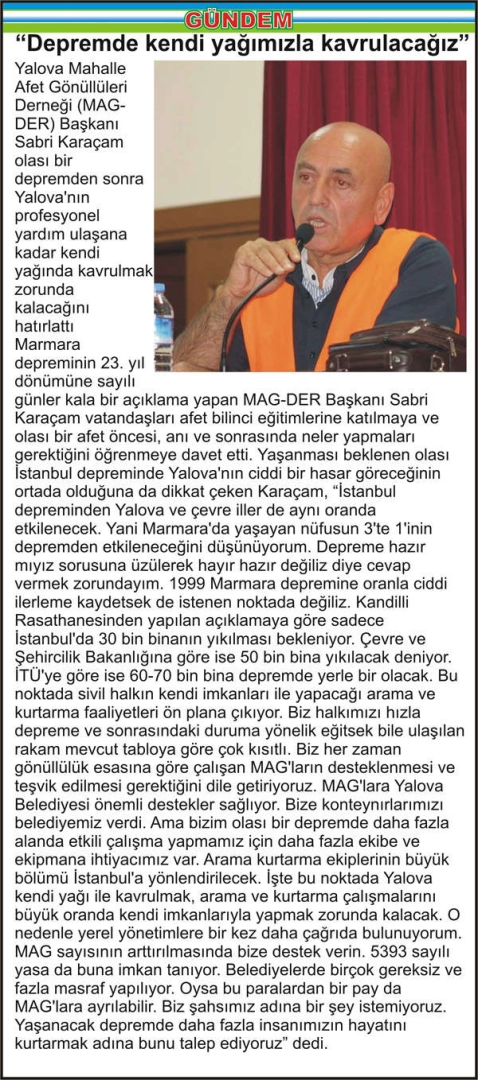 Yalova Mahalle Afet Gönüllüleri Derneği (MAG-DER) Başkanı Sabri Karaçam olası bir depremden sonra Yalova’nın profesyonel yardım ulaşana kadar kendi yağında kavrulmak zorunda kalacağını hatırlattı