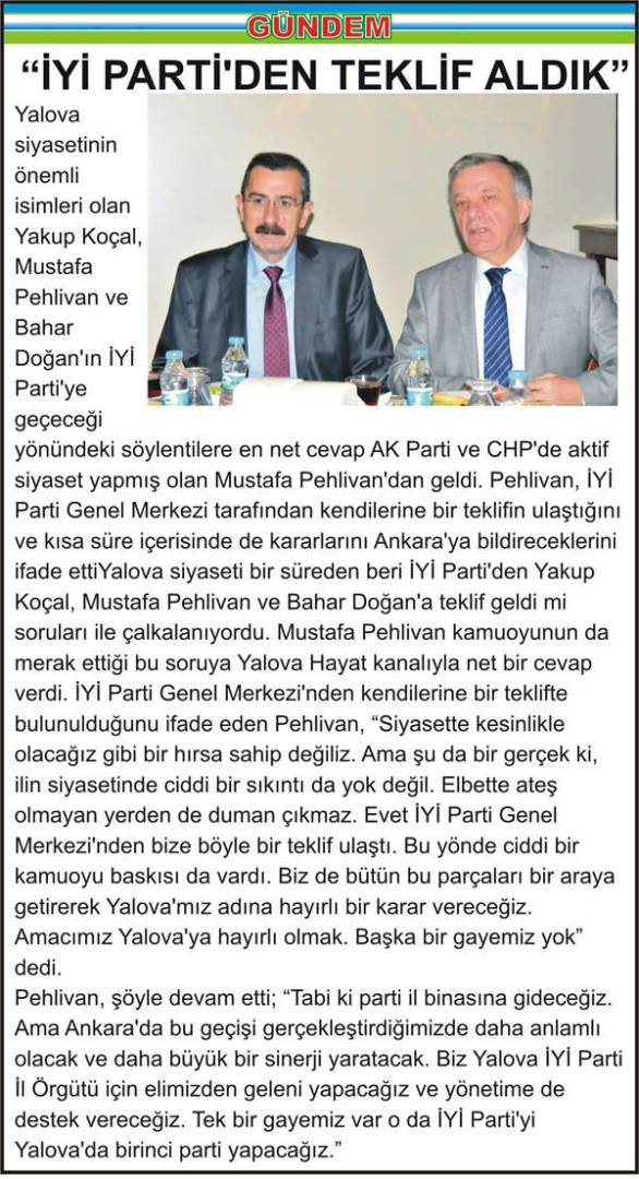 Yalova siyasetinin önemli isimleri olan Yakup Koçal, Mustafa Pehlivan ve Bahar Doğan’ın İYİ Parti’ye geçeceği yönündeki söylentilere en net cevap AK Parti ve CHP’de aktif siyaset yapmış olan Mustafa Pehlivan’dan geldi. Pehlivan, İYİ Parti Genel Merkezi tarafından kendilerine bir teklifin ulaştığını ve kısa süre içerisinde de kararlarını Ankara’ya bildireceklerini ifade ettiYalova siyaseti bir süreden beri İYİ Parti’den Yakup Koçal, Mustafa Pehlivan ve Bahar Doğan’a teklif geldi mi soruları ile çalkalanıyordu. Mustafa Pehlivan kamuoyunun da merak ettiği bu soruya Yalova Hayat kanalıyla net bir cevap verdi. İYİ Parti Genel Merkezi’nden kendilerine bir teklifte bulunulduğunu ifade eden Pehlivan, “Siyasette kesinlikle olacağız gibi bir hırsa sahip değiliz. Ama şu da bir gerçek ki, ilin siyasetinde ciddi bir sıkıntı da yok değil. Elbette ateş olmayan yerden de duman çıkmaz. Evet İYİ Parti Genel Merkezi’nden bize böyle bir teklif ulaştı. Bu yönde ciddi bir kamuoyu baskısı da vardı. Biz de bütün bu parçaları bir araya getirerek Yalova’mız adına hayırlı bir karar vereceğiz. Amacımız Yalova’ya hayırlı olmak. Başka bir gayemiz yok” dedi.