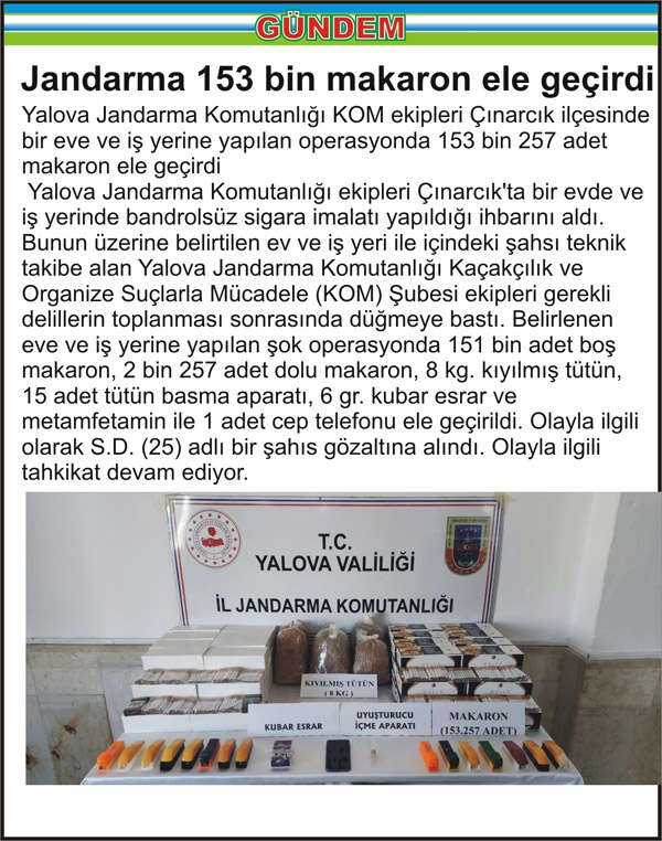 Yalova Jandarma Komutanlığı KOM ekipleri Çınarcık ilçesinde bir eve ve iş yerine yapılan operasyonda 153 bin 257 adet makaron ele geçirdi Yalova Jandarma Komutanlığı ekipleri Çınarcık’ta bir evde ve iş yerinde bandrolsüz sigara imalatı yapıldığı ihbarını aldı. Bunun üzerine belirtilen ev ve iş yeri ile içindeki şahsı teknik takibe alan Yalova Jandarma Komutanlığı Kaçakçılık ve Organize Suçlarla Mücadele (KOM) Şubesi ekipleri gerekli delillerin toplanması sonrasında düğmeye bastı. Belirlenen eve ve iş yerine yapılan şok operasyonda 151 bin adet boş makaron, 2 bin 257 adet dolu makaron, 8 kg. kıyılmış tütün, 15 adet tütün basma aparatı, 6 gr. kubar esrar ve metamfetamin ile 1 adet cep telefonu ele geçirildi. Olayla ilgili olarak S.D. (25) adlı bir şahıs gözaltına alındı. Olayla ilgili tahkikat devam ediyor.