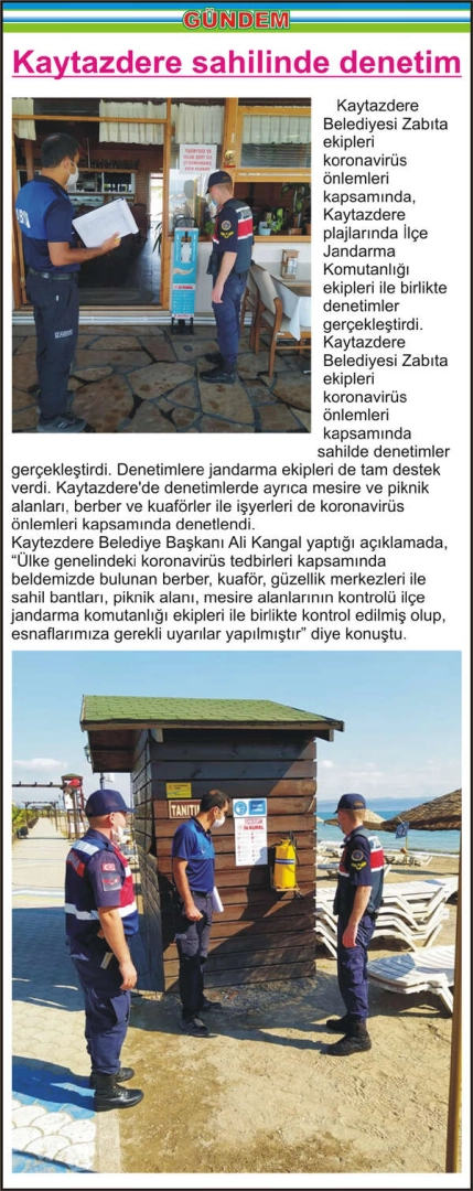 Kaytazdere sahilinde denetim Kaytazdere Belediyesi Zabıta ekipleri koronavirüs önlemleri kapsamında, Kaytazdere plajlarında İlçe Jandarma Komutanlığı ekipleri ile birlikte denetimler gerçekleştirdi. Kaytazdere Belediyesi Zabıta ekipleri koronavirüs önlemleri kapsamında sahilde denetimler gerçekleştirdi. Denetimlere jandarma ekipleri de tam destek verdi. Kaytazdere’de denetimlerde ayrıca mesire ve piknik alanları, berber ve kuaförler ile işyerleri de koronavirüs önlemleri kapsamında denetlendi. Kaytezdere Belediye Başkanı Ali Kangal yaptığı açıklamada, “Ülke genelindeki koronavirüs tedbirleri kapsamında beldemizde bulunan berber, kuaför, güzellik merkezleri ile sahil bantları, piknik alanı, mesire alanlarının kontrolü ilçe jandarma komutanlığı ekipleri ile birlikte kontrol edilmiş olup, esnaflarımıza gerekli uyarılar yapılmıştır” diye konuştu.