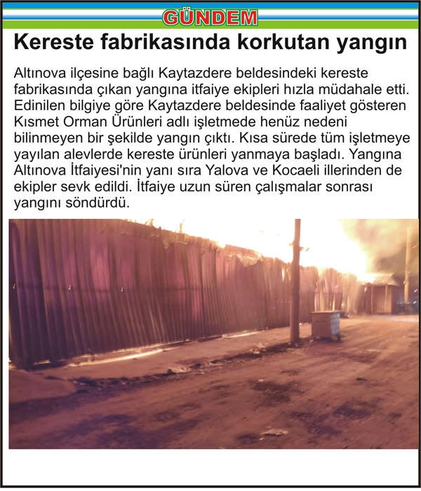 Altınova ilçesine bağlı Kaytazdere beldesindeki kereste fabrikasında çıkan yangına itfaiye ekipleri hızla müdahale etti. Edinilen bilgiye göre Kaytazdere beldesinde faaliyet gösteren Kısmet Orman Ürünleri adlı işletmede henüz nedeni bilinmeyen bir şekilde yangın çıktı. Kısa sürede tüm işletmeye yayılan alevlerde kereste ürünleri yanmaya başladı. Yangına Altınova İtfaiyesi'nin yanı sıra Yalova ve Kocaeli illerinden de ekipler sevk edildi. İtfaiye uzun süren çalışmalar sonrası yangını söndürdü.