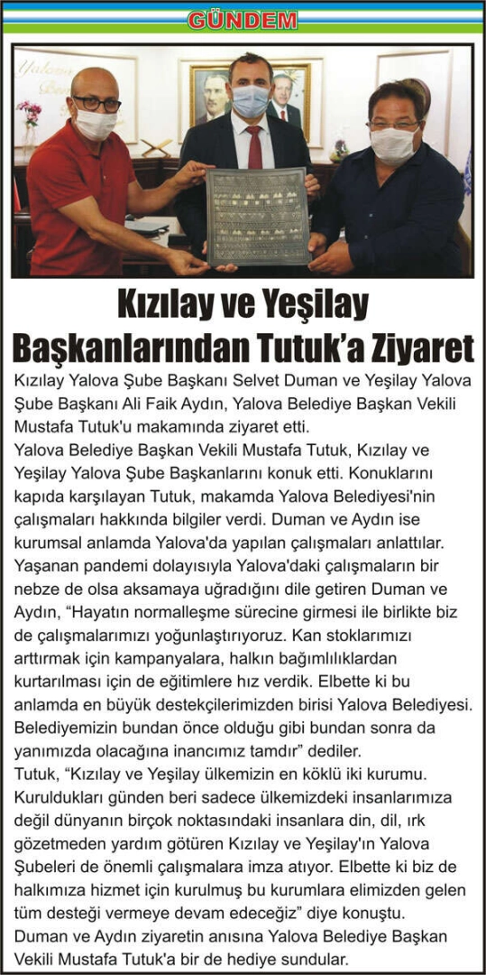 Kızılay ve Yeşilay Başkanlarından Tutuk’a ziyaret Kızılay Yalova Şube Başkanı Selvet Duman ve Yeşilay Yalova Şube Başkanı Ali Faik Aydın, Yalova Belediye Başkan Vekili Mustafa Tutuk’u makamında ziyaret etti Yalova Belediye Başkan Vekili Mustafa Tutuk, Kızılay ve Yeşilay Yalova Şube Başkanlarını konuk etti. Konuklarını kapıda karşılayan Tutuk, makamda Yalova Belediyesi’nin çalışmaları hakkında bilgiler verdi. Duman ve Aydın ise kurumsal anlamda Yalova’da yapılan çalışmaları anlattılar. Yaşanan pandemi dolayısıyla Yalova’daki çalışmaların bir nebze de olsa aksamaya uğradığını dile getiren Duman ve Aydın, “Hayatın normalleşme sürecine girmesi ile birlikte biz de çalışmalarımızı yoğunlaştırıyoruz. Kan stoklarımızı arttırmak için kampanyalara, halkın bağımlılıklardan kurtarılması için de eğitimlere hız verdik. Elbette ki bu anlamda en büyük destekçilerimizden birisi Yalova Belediyesi. Belediyemizin bundan önce olduğu gibi bundan sonra da yanımızda olacağına inancımız tamdır” dediler. Tutuk, “Kızılay ve Yeşilay ülkemizin en köklü iki kurumu. Kuruldukları günden beri sadece ülkemizdeki insanlarımıza değil dünyanın birçok noktasındaki insanlara din, dil, ırk gözetmeden yardım götüren Kızılay ve Yeşilay’ın Yalova Şubeleri de önemli çalışmalara imza atıyor. Elbette ki biz de halkımıza hizmet için kurulmuş bu kurumlara elimizden gelen tüm desteği vermeye devam edeceğiz” diye konuştu. Duman ve Aydın ziyaretin anısına Yalova Belediye Başkan Vekili Mustafa Tutuk’a bir de hediye sundular.