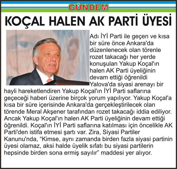 Adı İYİ Parti ile geçen ve kısa bir süre önce Ankara’da düzenlenecek olan törenle rozet takacağı her yerde konuşulan Yakup Koçal’ın halen AK Parti üyeliğinin devam ettiği öğrenildi Yalova’da siyasi arenayı bir hayli hareketlendiren Yakup Koçal’ın İYİ Parti saflarına geçeceği haberi üzerine birçok yorum yapılıyor. Yakup Koçal’a kısa bir süre içerisinde Ankara’da gerçekleştirilecek olan törende Meral Akşener tarafından rozet takacağı iddia ediliyor. Ancak Yakup Koçal’ın halen AK Parti üyeliğinin devam ettiği öğrenildi. Koçal’ın İYİ Parti saflarına katılması için öncelikle AK Parti’den istifa etmesi şartı var. Zira, Siyasi Partiler Kanunu’nda, “Kimse, aynı zamanda birden fazla siyasi partinin üyesi olamaz, aksi halde üyelik sıfatı bu siyasi partilerin hepsinde birden sona ermiş sayılır” maddesi yer alıyor.
