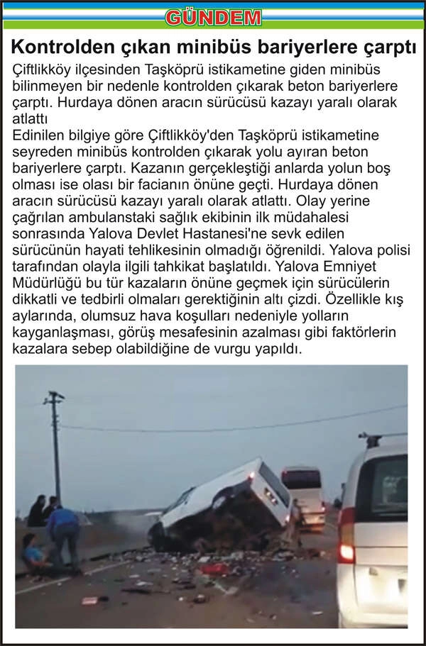Çiftlikköy ilçesinden Taşköprü istikametine giden minibüs bilinmeyen bir nedenle kontrolden çıkarak beton bariyerlere çarptı. Hurdaya dönen aracın sürücüsü kazayı yaralı olarak atlattı Edinilen bilgiye göre Çiftlikköy’den Taşköprü istikametine seyreden minibüs kontrolden çıkarak yolu ayıran beton bariyerlere çarptı. Kazanın gerçekleştiği anlarda yolun boş olması ise olası bir facianın önüne geçti. Hurdaya dönen aracın sürücüsü kazayı yaralı olarak atlattı. Olay yerine çağrılan ambulanstaki sağlık ekibinin ilk müdahalesi sonrasında Yalova Devlet Hastanesi’ne sevk edilen sürücünün hayati tehlikesinin olmadığı öğrenildi. Yalova polisi tarafından olayla ilgili tahkikat başlatıldı. Yalova Emniyet Müdürlüğü bu tür kazaların önüne geçmek için sürücülerin dikkatli ve tedbirli olmaları gerektiğinin altı çizdi. Özellikle kış aylarında, olumsuz hava koşulları nedeniyle yolların kayganlaşması, görüş mesafesinin azalması gibi faktörlerin kazalara sebep olabildiğine de vurgu yapıldı.