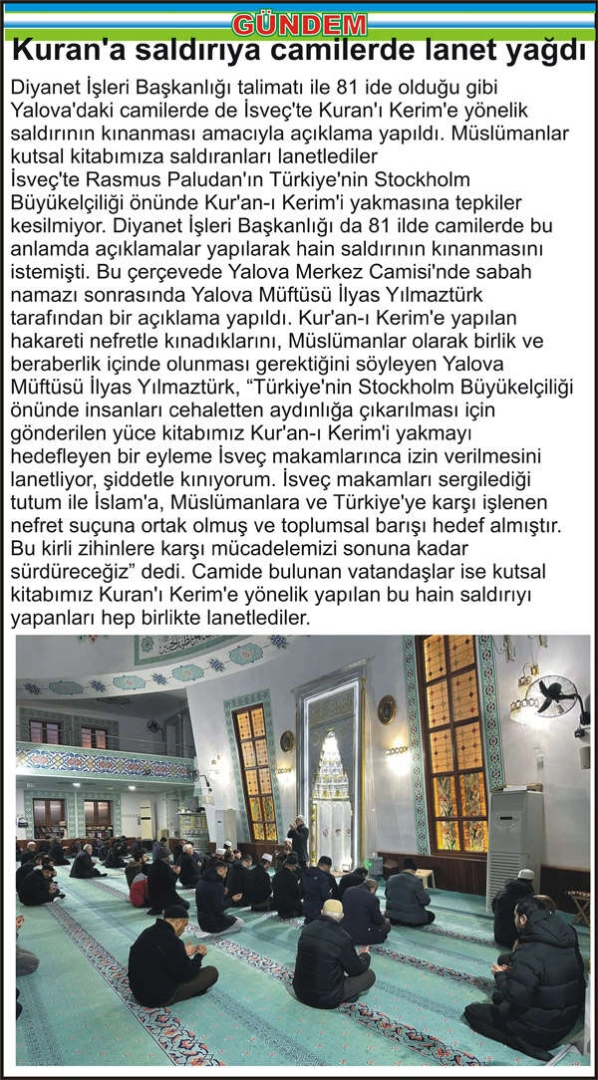 Diyanet İşleri Başkanlığı talimatı ile 81 ide olduğu gibi Yalova’daki camilerde de İsveç’te Kuran’ı Kerim’e yönelik saldırının kınanması amacıyla açıklama yapıldı. Müslümanlar kutsal kitabımıza saldıranları lanetlediler İsveç’te Rasmus Paludan’ın Türkiye'nin Stockholm Büyükelçiliği önünde Kur'an-ı Kerim’i yakmasına tepkiler kesilmiyor. Diyanet İşleri Başkanlığı da 81 ilde camilerde bu anlamda açıklamalar yapılarak hain saldırının kınanmasını istemişti. Bu çerçevede Yalova Merkez Camisi’nde sabah namazı sonrasında Yalova Müftüsü İlyas Yılmaztürk tarafından bir açıklama yapıldı. Kur'an-ı Kerim’e yapılan hakareti nefretle kınadıklarını, Müslümanlar olarak birlik ve beraberlik içinde olunması gerektiğini söyleyen Yalova Müftüsü İlyas Yılmaztürk, “Türkiye’nin Stockholm Büyükelçiliği önünde insanları cehaletten aydınlığa çıkarılması için gönderilen yüce kitabımız Kur’an-ı Kerim’i yakmayı hedefleyen bir eyleme İsveç makamlarınca izin verilmesini lanetliyor, şiddetle kınıyorum. İsveç makamları sergilediği tutum ile İslam’a, Müslümanlara ve Türkiye’ye karşı işlenen nefret suçuna ortak olmuş ve toplumsal barışı hedef almıştır. Bu kirli zihinlere karşı mücadelemizi sonuna kadar sürdüreceğiz” dedi. Camide bulunan vatandaşlar ise kutsal kitabımız Kuran’ı Kerim’e yönelik yapılan bu hain saldırıyı yapanları hep birlikte lanetlediler.