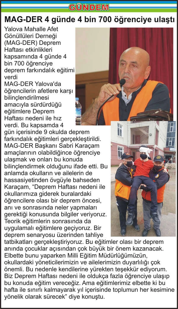Yalova Mahalle Afet Gönüllüleri Derneği (MAG-DER) Deprem Haftası etkinlikleri kapsamında 4 günde 4 bin 700 öğrenciye deprem farkındalık eğitimi verdi