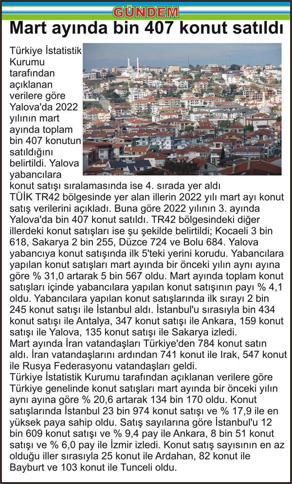 Türkiye İstatistik Kurumu tarafından açıklanan verilere göre Yalova’da 2022 yılının mart ayında toplam bin 407 konutun satıldığını belirtildi. Yalova yabancılara konut satışı sıralamasında ise 4. sırada yer aldı TÜİK TR42 bölgesinde yer alan illerin 2022 yılı mart ayı konut satış verilerini açıkladı. Buna göre 2022 yılının 3. ayında Yalova’da bin 407 konut satıldı. TR42 bölgesindeki diğer illerdeki konut satışları ise şu şekilde belirtildi; Kocaeli 3 bin 618, Sakarya 2 bin 255, Düzce 724 ve Bolu 684. Yalova yabancıya konut satışında ilk 5’teki yerini korudu. Yabancılara yapılan konut satışları mart ayında bir önceki yılın aynı ayına göre % 31,0 artarak 5 bin 567 oldu. Mart ayında toplam konut satışları içinde yabancılara yapılan konut satışının payı % 4,1 oldu. Yabancılara yapılan konut satışlarında ilk sırayı 2 bin 245 konut satışı ile İstanbul aldı. İstanbul'u sırasıyla bin 434 konut satışı ile Antalya, 347 konut satışı ile Ankara, 159 konut satışı ile Yalova, 135 konut satışı ile Sakarya izledi. Mart ayında İran vatandaşları Türkiye'den 784 konut satın aldı. İran vatandaşlarını ardından 741 konut ile Irak, 547 konut ile Rusya Federasyonu vatandaşları geldi. Türkiye İstatistik Kurumu tarafından açıklanan verilere göre Türkiye genelinde konut satışları mart ayında bir önceki yılın aynı ayına göre % 20,6 artarak 134 bin 170 oldu. Konut satışlarında İstanbul 23 bin 974 konut satışı ve % 17,9 ile en yüksek paya sahip oldu. Satış sayılarına göre İstanbul'u 12 bin 609 konut satışı ve % 9,4 pay ile Ankara, 8 bin 51 konut satışı ve % 6,0 pay ile İzmir izledi. Konut satış sayısının en az olduğu iller sırasıyla 25 konut ile Ardahan, 82 konut ile Bayburt ve 103 konut ile Tunceli oldu.