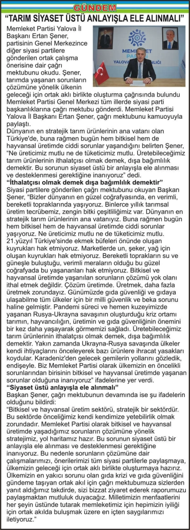 Memleket Partisi Yalova İl Başkanı Ertan Şener, partisinin Genel Merkezince diğer siyasi partilere gönderilen ortak çalışma önerisine dair çağrı mektubunu okudu. Şener, tarımda yaşanan sorunların çözümüne yönelik ülkenin geleceği için ortak aklı birlikte oluşturma çağrısında bulundu
