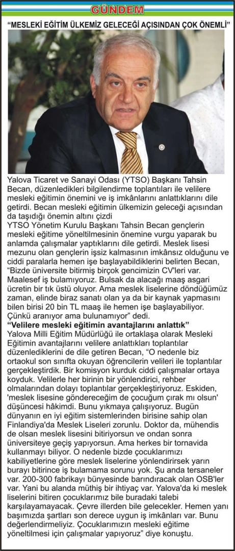 Yalova Ticaret ve Sanayi Odası (YTSO) Başkanı Tahsin Becan, düzenledikleri bilgilendirme toplantıları ile velilere mesleki eğitimin önemini ve iş imkânlarını anlattıklarını dile getirdi. Becan mesleki eğitimin ülkemizin geleceği açısından da taşıdığı önemin altını çizdi