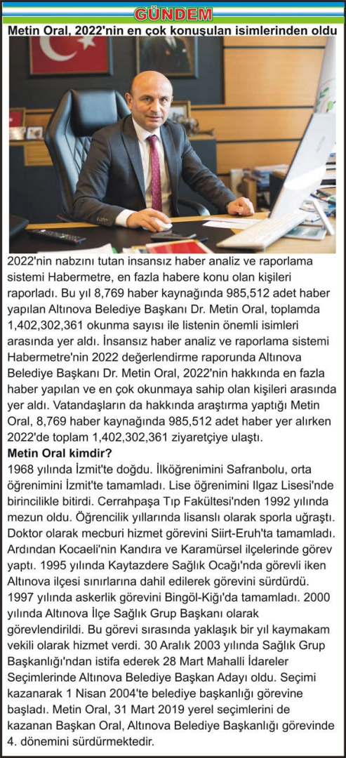 2022'nin nabzını tutan insansız haber analiz ve raporlama sistemi Habermetre, en fazla habere konu olan kişileri raporladı. Bu yıl 8,769 haber kaynağında 985,512 adet haber yapılan Altınova Belediye Başkanı Dr. Metin Oral, toplamda 1,402,302,361 okunma sayısı ile listenin önemli isimleri arasında yer aldı. İnsansız haber analiz ve raporlama sistemi Habermetre'nin 2022 değerlendirme raporunda Altınova Belediye Başkanı Dr. Metin Oral, 2022'nin hakkında en fazla haber yapılan ve en çok okunmaya sahip olan kişileri arasında yer aldı. Vatandaşların da hakkında araştırma yaptığı Metin Oral, 8,769 haber kaynağında 985,512 adet haber yer alırken 2022'de toplam 1,402,302,361 ziyaretçiye ulaştı. Metin Oral kimdir? 1968 yılında İzmit'te doğdu. İlköğrenimini Safranbolu, orta öğrenimini İzmit'te tamamladı. Lise öğrenimini Ilgaz Lisesi'nde birincilikle bitirdi. Cerrahpaşa Tıp Fakültesi'nden 1992 yılında mezun oldu. Öğrencilik yıllarında lisanslı olarak sporla uğraştı. Doktor olarak mecburi hizmet görevini Siirt-Eruh'ta tamamladı. Ardından Kocaeli'nin Kandıra ve Karamürsel ilçelerinde görev yaptı. 1995 yılında Kaytazdere Sağlık Ocağı'nda görevli iken Altınova ilçesi sınırlarına dahil edilerek görevini sürdürdü. 1997 yılında askerlik görevini Bingöl-Kiğı'da tamamladı. 2000 yılında Altınova İlçe Sağlık Grup Başkanı olarak görevlendirildi. Bu görevi sırasında yaklaşık bir yıl kaymakam vekili olarak hizmet verdi. 30 Aralık 2003 yılında Sağlık Grup Başkanlığı'ndan istifa ederek 28 Mart Mahalli İdareler Seçimlerinde Altınova Belediye Başkan Adayı oldu. Seçimi kazanarak 1 Nisan 2004'te belediye başkanlığı görevine başladı. Metin Oral, 31 Mart 2019 yerel seçimlerini de kazanan Başkan Oral, Altınova Belediye Başkanlığı görevinde 4. dönemini sürdürmektedir.