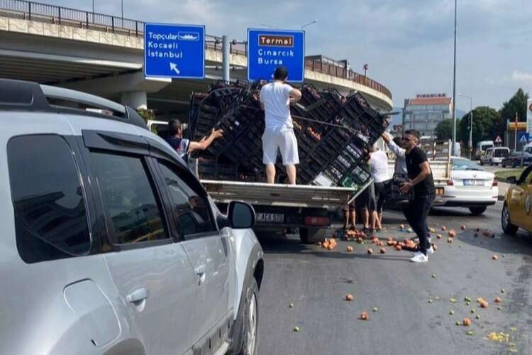 Yalova'nın Dörtyol bölgesinde meyve ve sebze yüklü bir kamyonun manevra yaparken taşıdığı kasaları devirmesi ile birlikte ürünler yola saçıldı. Şans eseri kazada yaralanan olmazken, maddi hasar meydana geldi.