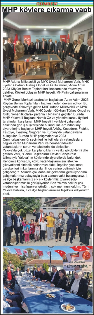 MHP Adana Milletvekili ve MYK Üyesi Muharrem Varlı, MHK üyeleri Gökhan Türkeş Öngel ve Güllü Yener, ‘Adım Adım 2023 Köyüm Benim Toplantıları’ kapsamında Yalova’ya geldiler. Köyleri dolaşan MHP heyeti, MHP’nin çalışmalarını anlattı