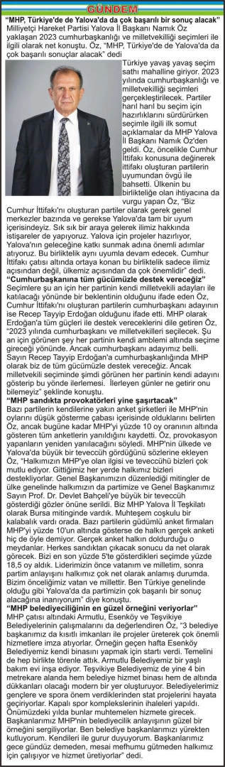 Milliyetçi Hareket Partisi Yalova İl Başkanı Namık Öz yaklaşan 2023 cumhurbaşkanlığı ve milletvekilliği seçimleri ile ilgili olarak net konuştu. Öz, “MHP, Türkiye’de de Yalova’da da çok başarılı sonuçlar alacak” dedi