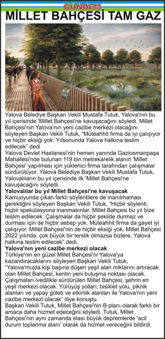 Yalova Belediye Başkan Vekili Mustafa Tutuk, Yalova’nın bu yıl içerisinde ‘Millet Bahçesi’ne kavuşacağını söyledi. Millet Bahçesi’nin Yalova’nın yeni cazibe merkezi olacağını söyleyen Başkan Vekili Tutuk, “Müteahhit firma da iyi çalışıyor ve hiçbir eksiği yok. Yılsonunda Yalova halkına teslim edilecek” dedi Yalova Devlet Hastanesi’nin hemen yanında Gaziosmanpaşa Mahallesi’nde bulunan 119 bin metrekarelik alanın ‘Millet Bahçesi’ yapılması için yüklenici firma tarafından çalışmalar sürdürülüyor. Yalova Belediye Başkan Vekili Mustafa Tutuk, Yalovalıların bu yıl içerisinde ilk ‘Millet Bahçesi’ne kavuşacağını söyledi. Yalovalılar bu yıl Millet Bahçesi’ne kavuşacak Kamuoyunda çıkan farklı söylentilere de inanılmaması gerektiğini söyleyen Başkan Vekili Tutuk, “Hiçbir söylenti, hiçbir spekülasyona inanmasınlar. Millet Bahçesi bu yıl bize teslim edilecek. Çalışmalar da hiçbir şekilde durmaz ve durması için de hiçbir sebep yok. Müteahhit firma da gayet iyi çalışıyor. Millet Bahçesi’nin de hiçbir eksiği yok. Millet Bahçesi 2022 yılında, çok büyük bir terslik olmazsa bizlere, Yalova halkına teslim edilecek” dedi. Yalova’nın yeni cazibe merkezi olacak Türkiye’nin en güzel Millet Bahçesi’ni Yalova’ya kazandıracaklarını söyleyen Başkan Vekili Tutuk, “Yalova’mızda kişi başına düşen yeşil alan miktarını artıracak olan Millet Bahçesi, kentin yeni buluşma noktası olacak. Çalışmaları ivedilikle sürdürülen Millet Bahçesi, şehrin en yeşil merkezi olacak. Yürüyüş yolları, bisiklet yolu, piknik alanları ve yapay göleti ve etkinlik alanları ile Yalova’nın yeni cazibe merkezi olacak” diye konuştu. Başkan Vekili Tutuk, Millet Bahçesi’nin B planı olarak farklı bir amaca daha hizmet edeceğini söyledi. Tutuk, Millet Bahçesi’nin aynı zamanda olası büyük depremlerde ‘acil durum toplanma alanı’ olarak da hizmet vereceğini bildirdi.