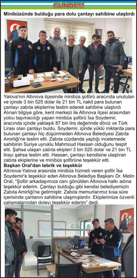 Yalova'nın Altınova ilçesinde minibüs şoförü aracında unutulan ve içinde 3 bin 525 dolar ile 21 bin TL nakit para bulunan çantayı zabıta ekiplerine teslim ederek sahibine ulaştırdı Alınan bilgiye göre, kent merkezi ile Altınova ilçesi arasından yolcu taşımacılığı yapan minibüs şoförü İsa Soydemir, aracında içinde yaklaşık 87 bin lira değerinde döviz ve Türk Lirası olan çantayı buldu. Soydemir, içinde yüklü miktarda para bulunan çantayı hiç düşünmeden Altınova Belediyesi Zabıta Amirliği'ne teslim etti. Zabıta cüzdanda yaptığı incelemede sahibinin Suriye uyruklu Mahmoud Hassan olduğunu tespit etti. Şahsa ulaşan zabıta ekipleri 3 bin 525 dolar ve 21 bin TL lirayı şahsa teslim etti. Hassan, çantayı kendisine ulaştıran zabıta ekiplerine ve minibüs şoförüne teşekkür etti. Başkan Oral’dan tebrik ve teşekkür Altınova-Yalova arasında minibüs hizmeti veren şoför İsa Soydemir’e teşekkür eden Altınova Belediye Başkanı Dr. Metin Oral, “Şoför arkadaşımıza canı gönülden Altınova halkı adına teşekkür ederim. Çantayı bulduğu gibi kendisi belediyemizin Zabıta Amirliği’ne getirmiştir. Zabıta memurlarımız kısa süre içerisinde çantanın sahibine ulaşmışlardır. Ekiplerimize özverili çalışmalarından dolayı teşekkür ederim” dedi.