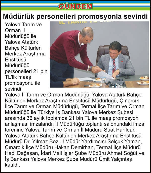 Yalova Tarım ve Orman İl Müdürlüğü ile Yalova Atatürk Bahçe Kültürleri Merkez Araştırma Enstitüsü Müdürlüğü personelleri 21 bin TL’lik maaş promosyonu ile sevindi Yalova İl Tarım ve Orman Müdürlüğü, Yalova Atatürk Bahçe Kültürleri Merkez Araştırma Enstitüsü Müdürlüğü, Çınarcık İlçe Tarım ve Orman Müdürlüğü, Termal İlçe Tarım ve Orman Müdürlüğü ile Türkiye İş Bankası Yalova Merkez Şubesi arasında 36 aylık toplamda 21 bin TL ile maaş promosyon anlaşması imzalandı. İl Müdürlüğü toplantı salonundaki imza törenine Yalova Tarım ve Orman İl Müdürü Suat Parıldar, Yalova Atatürk Bahçe Kültürleri Merkez Araştırma Enstitüsü Müdürü Dr. Yılmaz Boz, İl Müdür Yardımcısı Selçuk Yaman, Çınarcık İlçe Müdürü Hakan Demirhan, Termal İlçe Müdürü Hadi Dağaşan, İdari Mali İşler Şube Müdürü Ahmet Söğüt ve İş Bankası Yalova Merkez Şube Müdürü Ümit Yalçıntaş katıldı.