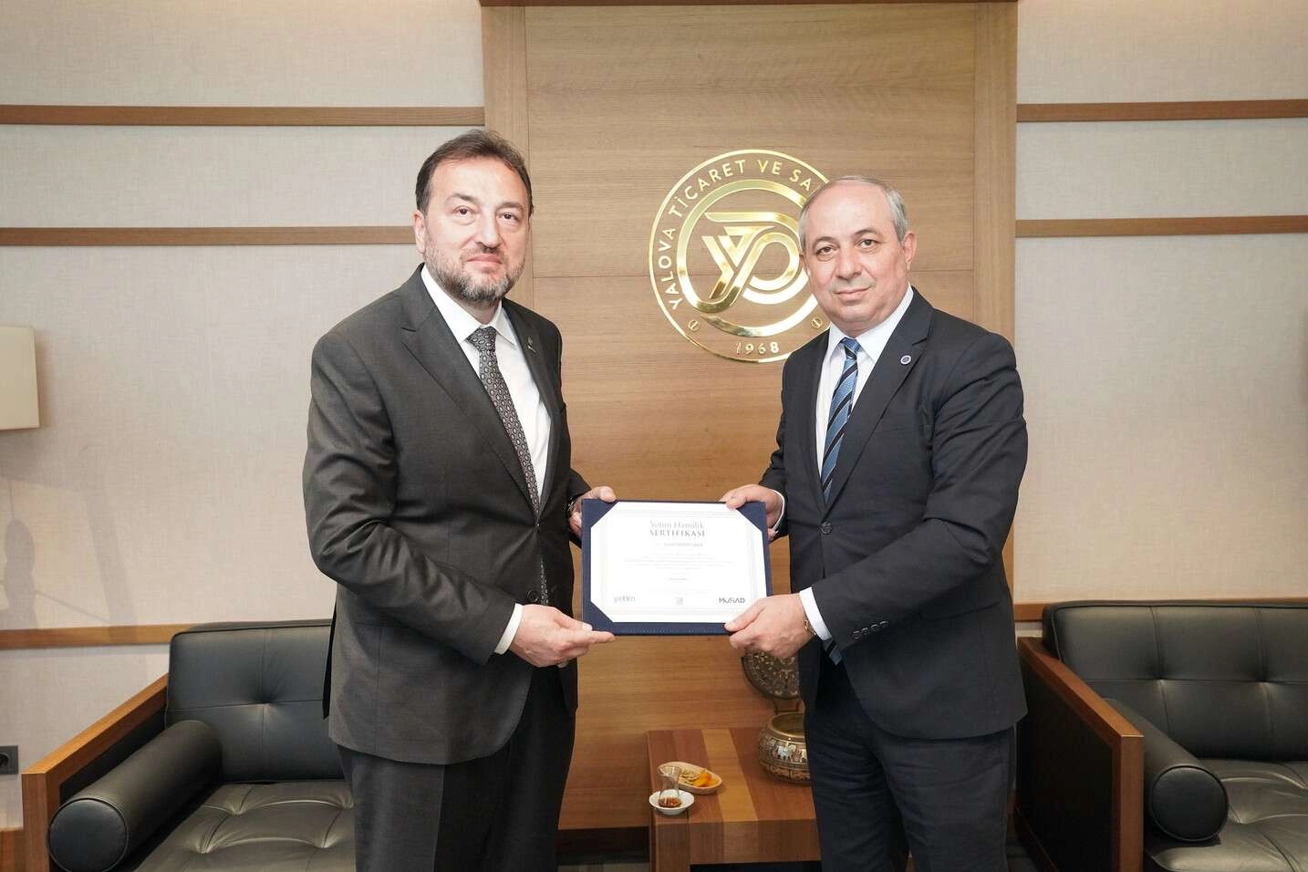 MÜSİAD Yalova Şube Açılış Gala Programına katılmak üzere Yalova’ya gelen MÜSİAD Genel Başkanı Mahmut Asmalı, Yalova Ticaret Sanayi Odası’na ziyarette bulundu. Asmalı ve beraberinde Abdüssamet Temel, Cihat Terzioğlu, Halil Zahid Bingöl, Kadir Büyükhelvacıgil, Kadir Abalı YTSO Yönetim Kurulu Başkanı Cemil Demiryürek ile bir araya geldi. Ülke gündemi ve Yalova ticaretinin konuşulduğu toplantıya YTSO Yönetim Kurulu Üyeleri ve Meclis Üyeleri katılım sağladı. Asmalı, misafirperverliklerinden dolayı Demiryürek ve YTSO Yönetim Kurulu Üyelerine teşekkür etti.