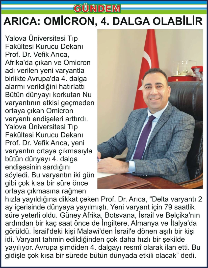 Yalova Üniversitesi Týp Fakültesi Kurucu Dekaný Prof. Dr. Vefik Arýca, Afrika'da çýkan ve Omicron adý verilen yeni varyantla birlikte Avrupa'da 4. dalga alarmý verildiðini hatýrlattý