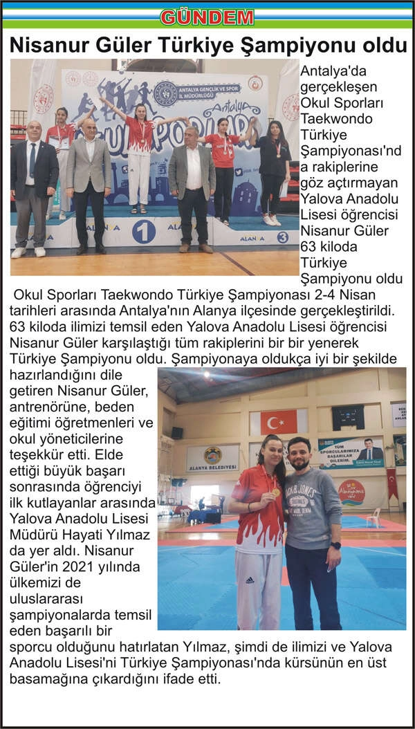 Antalya’da gerçekleşen Okul Sporları Taekwondo Türkiye Şampiyonası’nda rakiplerine göz açtırmayan Yalova Anadolu Lisesi öğrencisi Nisanur Güler 63 kiloda Türkiye Şampiyonu oldu