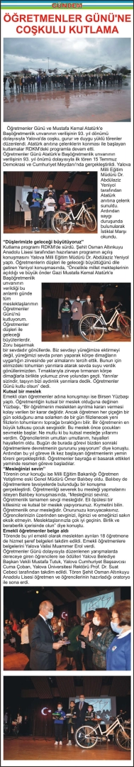 ÖĞRETMENLER GÜNÜ’NE COŞKULU KUTLAMA Öğretmenler Günü ve Mustafa Kemal Atatürk’e Başöğretmenlik unvanının verilişinin 93. yıl dönümü dolayısıyla Yalova’da coşku, gurur ve duygu yüklü törenler düzenlendi. Atatürk anıtına çelenklerin konması ile başlayan kutlamalar RDKM’deki programla devam etti. Öğretmenler Günü Atatürk’e Başöğretmenlik unvanının verilişinin 93. yıl önümü dolayısıyla ilk tören 15 Temmuz Demokrasi ve Cumhuriyet Meydanı’nda gerçekleştirildi. Yalova Milli Eğitim Müdürü Dr. Abdülaziz Yeniyol tarafından Atatürk anıtına çelenk sunuldu. Ardından saygı duruşunda bulunularak İstiklal Marşı okundu. “Düşlerimizle geleceği büyütüyoruz” Kutlama programı RDKM’de sürdü. Şehit Osman Altınkuyu Anadolu Lisesi tarafından hazırlanan programın açılış konuşmasını Yalova Milli Eğitim Müdürü Dr. Abdülaziz Yeniyol yaptı. Öğretmenlerin düşleri ile geleceği büyüttüğünü dile getiren Yeniyol konuşmasında, “Öncelikle millet mekteplerinin açıldığı ve büyük önder Gazi Mustafa Kemal Atatürk’e Başöğretmenlik unvanının verildiği bu anlamlı günde tüm meslektaşlarımın Öğretmenler Günü’nü kutluyorum. Öğretmenler düşleri ile geleceği büyütenlerdir. Zoru başarmak bir sevdadır gönüllerde. Biz sevdayı yüreğimize ektirmeyi değil, yüreğimizi sevda pınarı yaparak körpe dimağların uygarlığın zirvesinde yer almalarını tercih ettik. Bunun için elimizdeki tohumları yarınlara atarak sevda suyu verdik gönüllerimizden. Tırnaklarıyla zirveye tırmanan körpe dimağlarla birlikte yolumuz zirve yolundan geçti. Yarınlar sizindir, taşıyın bizi aydınlık yarınlara dedik. Öğretmenler Günü kutlu olsun” dedi. Kutsal bir meslek Emekli olan öğretmenler adına konuşmayı ise Birsen Yüzbaşı yaptı. Öğretmenliğin kutsal bir meslek olduğuna değinen Yüzbaşı, “Bir öğretmenin meslekten ayrılma kararı vermesi kolay verilen bir karar değildir. Ancak öğretmen her çiçeğin bir gün solduğunu ama solarken de bir gün filizlenecek yeni filizlerin tohumlarını toprağa bıraktığını bilir. Bir öğretmenin en büyük tutkusu çocuk sevgisidir. Bu meslek önce çocukları sevmekle başlar. Ne mutlu ki bu kutsal mesleğe yıllarımı verdim. Öğrencilerimin umutları umutlarım, hayalleri hayallerim oldu. Bugün de burada görevi bizden sonraki öğretmenlere devretmenin gururunu yaşıyorum” diye konuştu. Ardından bu yıl göreve ilk kez başlayan öğretmenlerin yemin töreni gerçekleştirildi. Öğretmenler bayrağa el basarak ettikleri yeminde resmen göreve başladılar. “Mesleğinizi sevin” Törenin onur konuğu ise Milli Eğitim Bakanlığı Öğretmen Yetiştirme eski Genel Müdürü Ömer Balıbey oldu. Balıbey de öğretmenlere tavsiyelerde bulunduğu bir konuşma gerçekleştirdi. Öğretmenliği severek bu mesleği yapmalarını isteyen Balıbey konuşmasında, “Mesleğinizi seviniz. Öğretmenlik tamamen sevgi mesleğidir. Eli öpülesi bir kitlesiniz ve kutsal bir meslek yapıyorsunuz. Kıymetini bilin. Öğretmenlik onur mesleğidir. Onurunuzu koruyacaksınız. Öğrencilerinizin üzerinden sevginizi, ilginizi ve emeğinizi sakın eksik etmeyin. Meslektaşlarınızla çok iyi geçinin. Birlik ve beraberlik içerisinde olun” diye konuştu. Emekli öğretmenler belge aldı Törende bu yıl emekli olarak meslekten ayrılan 18 öğretmene de hizmet şeref belgeleri takdim edildi. Emekli öğretmenlere belgelerini Yalova Valisi Muammer Erol verdi. Öğretmenler Günü dolayısıyla düzenlenen yarışmalarda dereceye giren öğrencilere ise ödülleri Yalova Belediye Başkan Vekili Mustafa Tutuk, Yalova Cumhuriyet Başsavcısı Cuma Çoban, Yalova Üniversitesi Rektörü Prof. Dr. Suat Cebeci tarafından takdim edildi. Tören Şehit Osman Altınkuyu Anadolu Lisesi öğretmen ve öğrencilerinin hazırladığı oratoryo ile sona erdi.