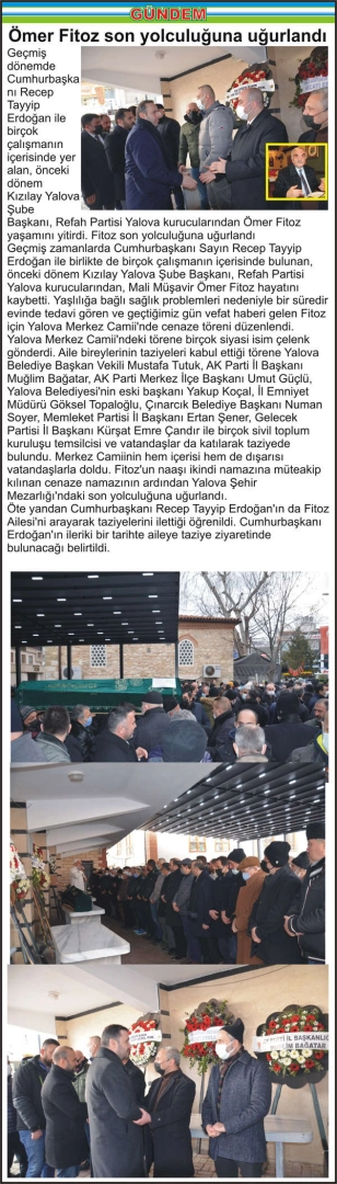Geçmiş dönemde Cumhurbaşkanı Recep Tayyip Erdoğan ile birçok çalışmanın içerisinde yer alan, önceki dönem Kızılay Yalova Şube Başkanı, Refah Partisi Yalova kurucularından Ömer Fitoz yaşamını yitirdi. Fitoz son yolculuğuna uğurlandı
