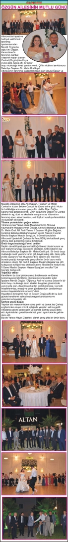 Altınova’da inşaat ve hafriyat sektörünün tanınmış işadamlarından Mevlüt Özgün’ün oğlu Anıl Özgün, Karamürsel’in tanınmış Canbal Ailesi’nin kızları Selcen Canbal (Özgün) ile dünya evine girdi. Genç çift, bir ömür boyu mutluluğa ‘evet’ yanıtını verdi. Çiftin nikâhını ise Altınova Belediye Başkanı Dr. Metin Oral kıydı Altınova’nın tanınmış işadamlarından olan Mevlüt Özgün ve Mücella Özgün’ün oğlu Anıl Özgün, Hüseyin ve Meral Canbal’ın kızları Selcen Canbal ile dünya evine girdi. Mutlu bir birlikteliğe adım atan genç çiftin nikâhı Altan Düğün Salonu’nda gerçekleştirildi. Çiftin düğününe Özgün ve Canbal ailelerinin eş, dost ve akrabalarının yanı sıra Yalova’nın tanınmış spor, sanat camiası, sivil toplum kuruluşu temsilcileri ve siyasileri de katıldı. Törene protokolden yoğun katılım Törene ayrıca Yalova Valisi Muammer Erol, Altınova Kaymakamı Regaip Ahmet Özyiğit, Altınova Belediye Başkanı Dr. Metin Oral, AK Parti Yalova İl Başkanı Muğlim Bağatar, Çınarcık Belediye Başkanı Numan Soyer, Yalova İl Genel Meclisi Başkanı Hasan Soygüzel, İl Genel Meclisi’nin Altınovalı Üyeleri Ali Çorbacı ile Resul Çiftçi de katılarak genç çifti bu özel günlerinde yalnız bırakmadı. Ömür boyu mutluluğa ‘evet’ dediler Seçkin davetli topluluğunun katıldığı törene birçok kurum ve sivil toplum kuruluşu da çelenk gönderdi. Çiftin nikâhını ise Altınova Belediye Başkanı Dr. Metin Oral kıydı. Bir ömür boyu mutluluğa ‘evet’ yanıtını veren çift, büyük alkış aldı. Genç çifte evlilik cüzdanını Vali Muammer Erol takdim etti. Vali Erol burada yaptığı konuşmada genç çifte bir ömür boyu mutlu olmalarını diledi. AK Parti İl Başkanı Muğlim Bağatar ise çifti kutlayarak evliliğe imza attıkları kalemi kendilerine hediye etti. İl Genel Meclisi Başkanı Hasan Soygüzel ise çifte Türk bayrağı hediye etti. Teşekkür ettiler Kendilerini bu özel günde yalnız bırakmayan ve törene katılamayarak tebriklerini gönderenlere teşekkür eden İşadamı Mevlüt Özgün, “Oğlumuz Anıl ve kızımız Selcen’in bir ömür boyu mutluluğa adım attıkları bu güzel günümüzde yanımızda olan, davetimize katılan protokolümüze, kıymetli misafirlerimize, mesaj ve çiçek gönderen tüm dostlarımıza sonsuz teşekkürlerimi sunarım” dedi. Hayatlarını birleştiren Anıl ve Selcen Özgün çifti de bu özel günde kendilerini yalnız bırakmayan konuklarına ve yakınlarına teşekkür etti. Çerkez usulü düğün Yapılan takı merasiminden sonra gelin ve damat ise Çerkez ezgilerinden oluşan müzik eşliğinde yeniden salona geldi. Alkışlarla salona gelen gelin ve damat, Çerkez usulü dans etti. Ayakkabıları çıkartılan damat, yalın ayak kalarak gelinle dans etti. Biz de Yalova Hayat Gazetesi olarak genç çifte bir ömür boyu mutluluklar diliyoruz.