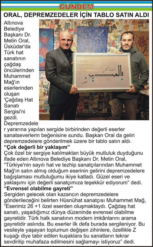 Altınova Belediye Başkanı Dr. Metin Oral, Üsküdar’da Türk hat sanatının çağdaş öncülerinden Muhammet Mağ’ın eserlerinden oluşan ‘Çağdaş Hat Sanatı Sergisi’ni gezdi.